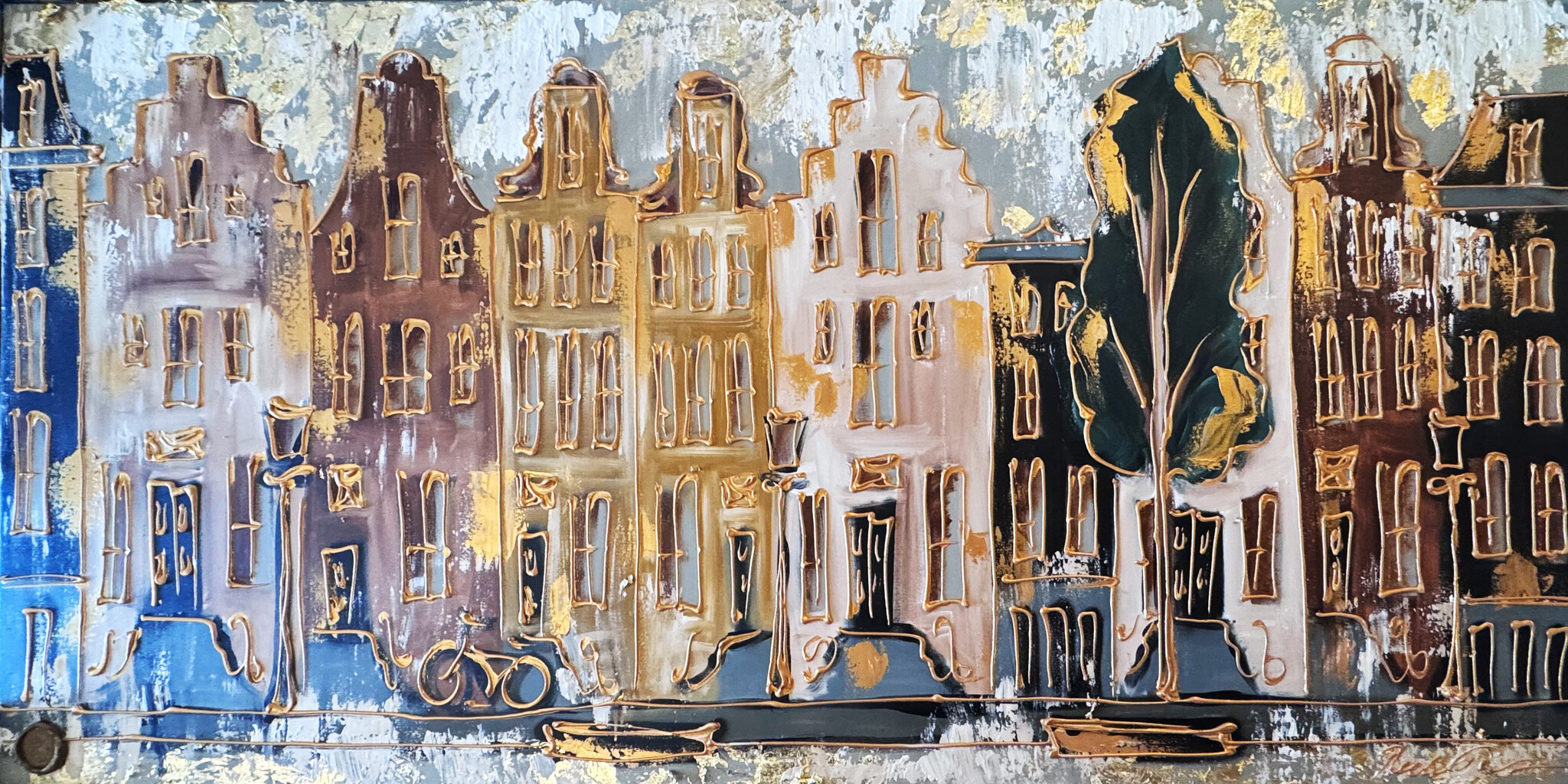• Schilderij- 100x200cm - Amsterdam LUXURY style - grachten gevels in omber & Gold #9