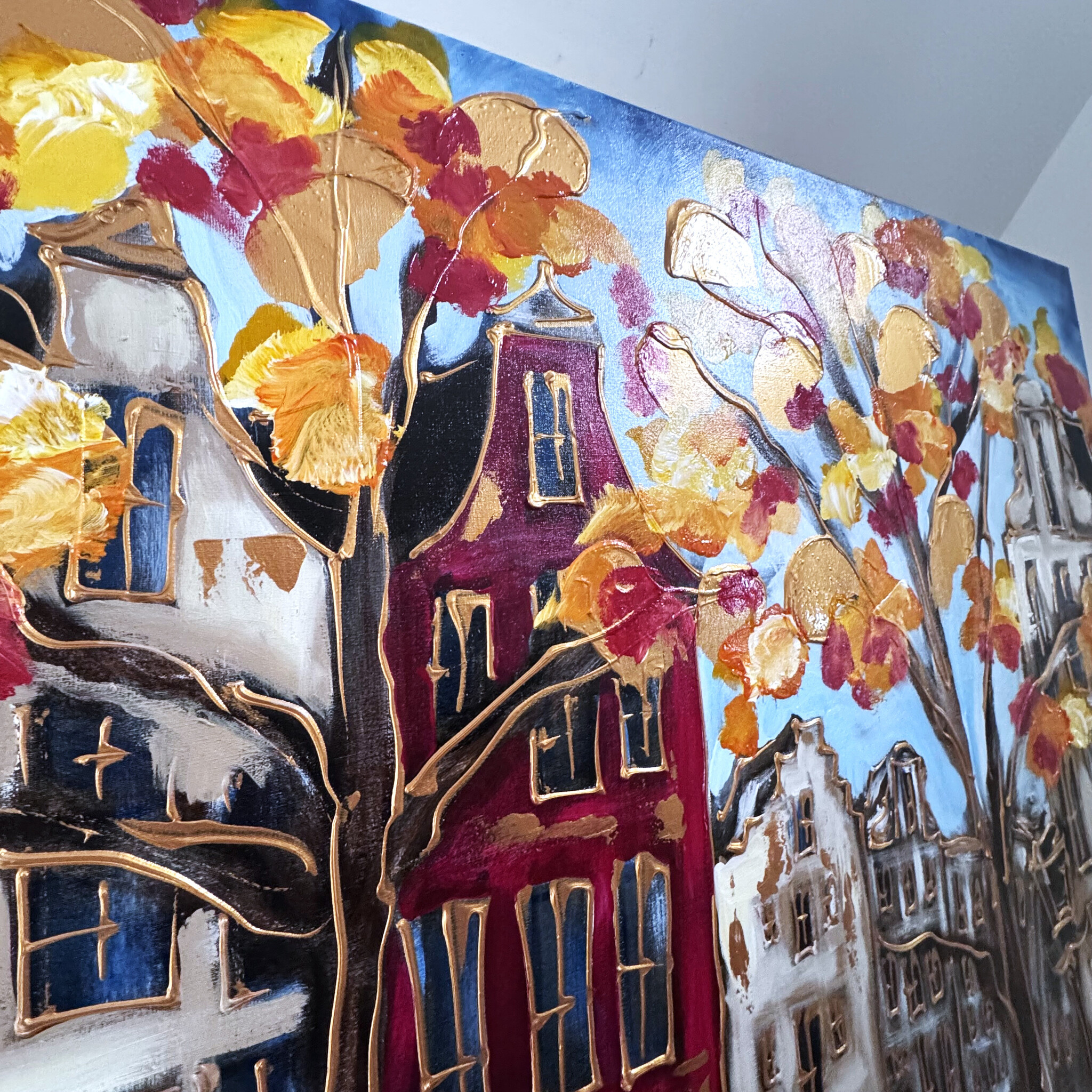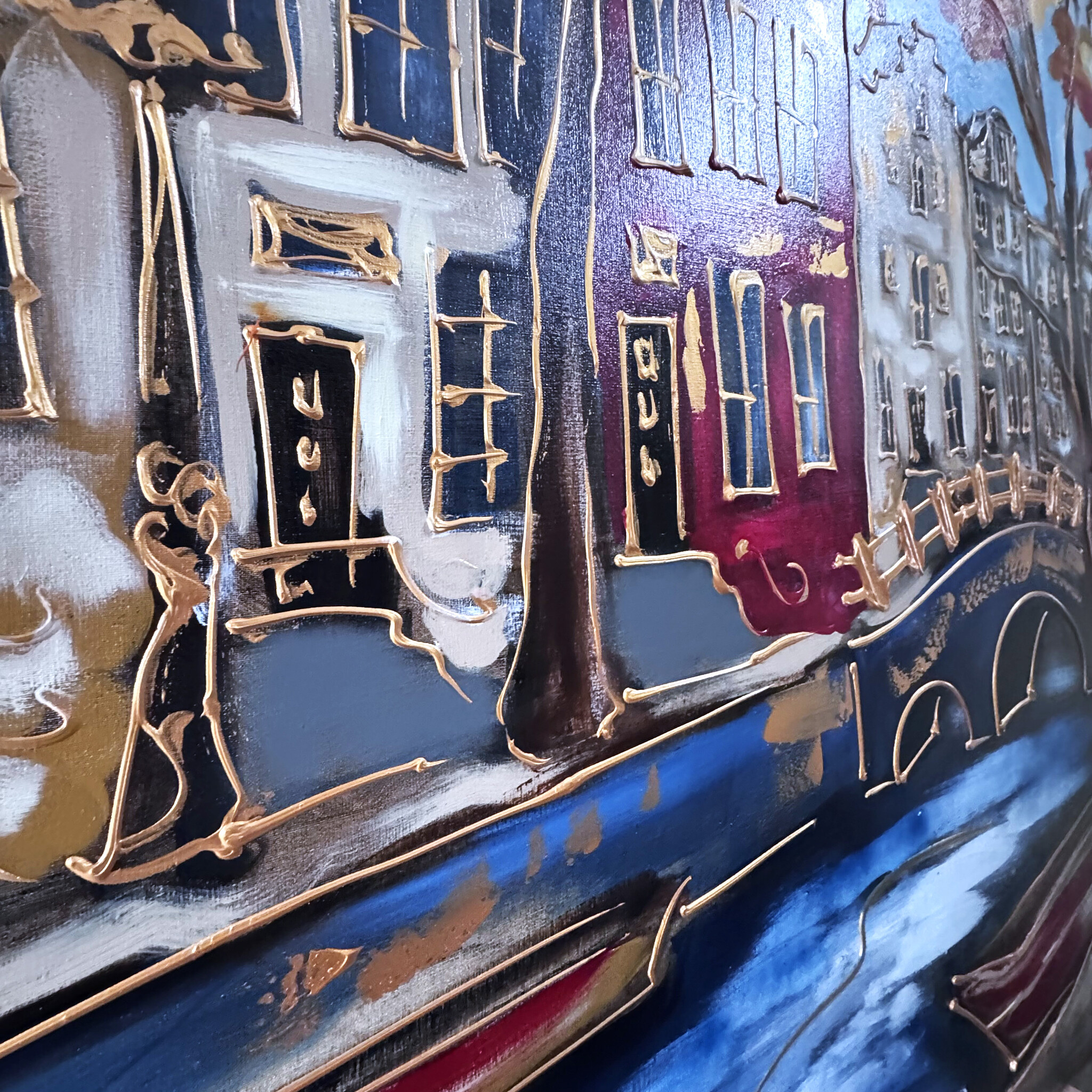 Artist Note: Mijn werken in de Amsterdam serie, zijn gemaakt in diverse lagen acryl verf, geïnspireerd op de glacis techniek van Rembrandt. Ook zo zichtbaar is de frottis techniek van de droge kwast in combinatie met in Parijs gekocht oliepastels van Sennelier (bekend van Picasso). Ook is de vrije tekenstijl, die ik opzet met houtskool, zeer kenmerkend. Elke laag van het werk ligt bloot door deze gemengde technieken.
