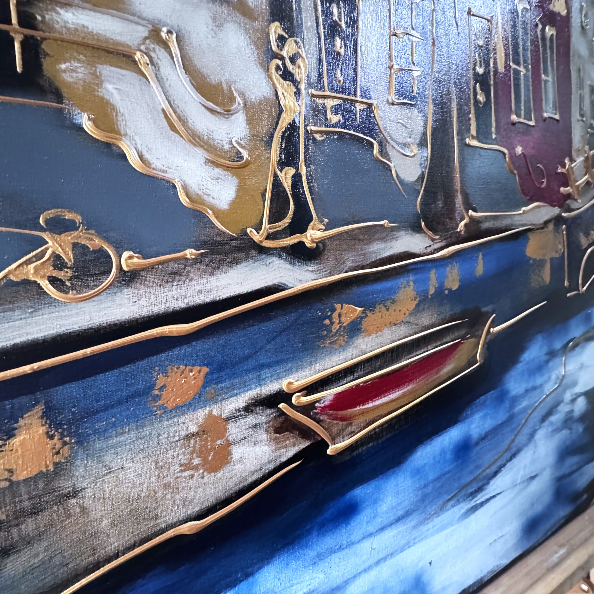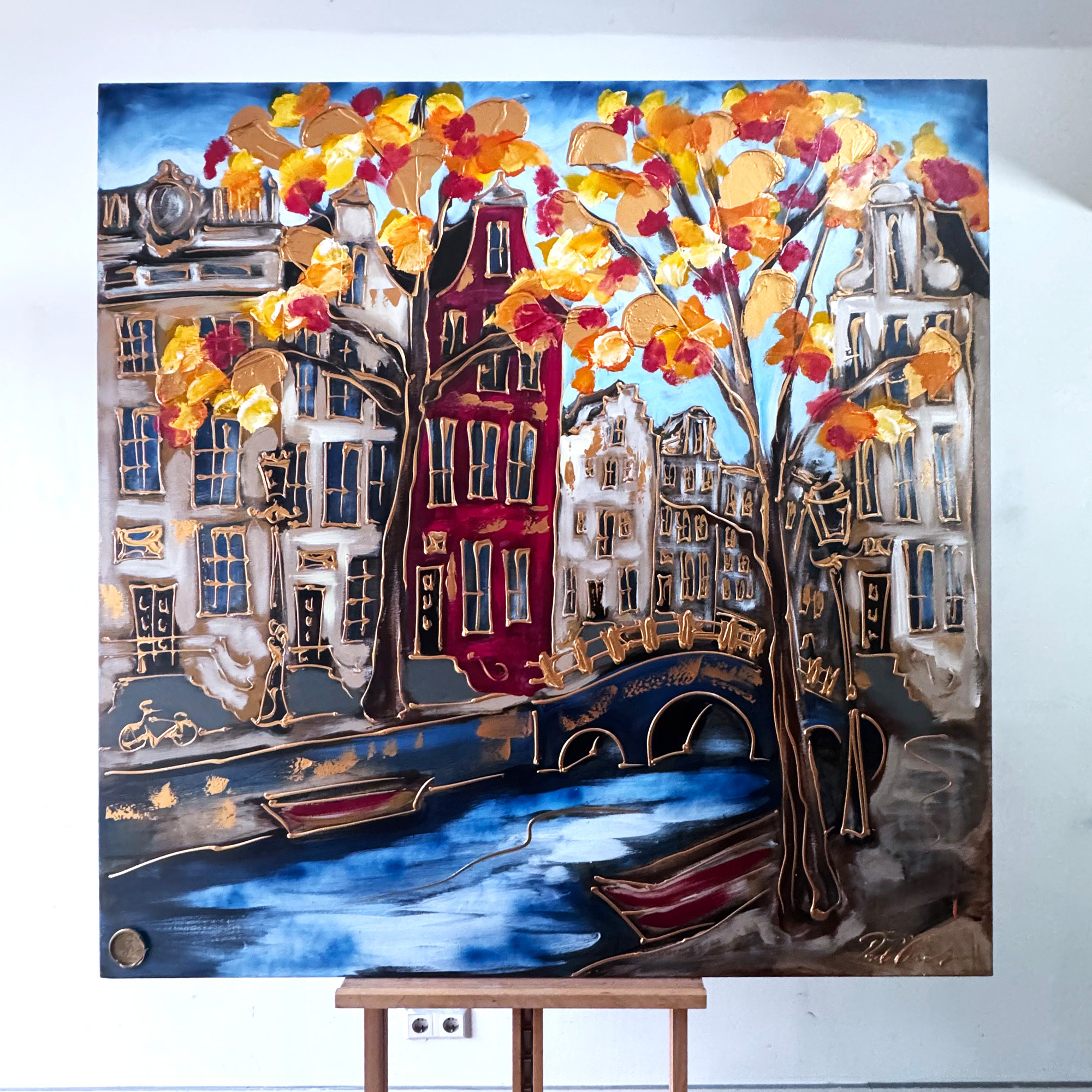 Rick bouwt zijn Amsterdam schilderijen op uit dikke lagen verf en werkt met een duidelijk handschrift wat zijn signatuur vormt. De dikke gouden lijn tekening waarmee zijn werk wordt afgemaakt doet de kijker al snel denken aan Amsterdam in de gouden eeuw.