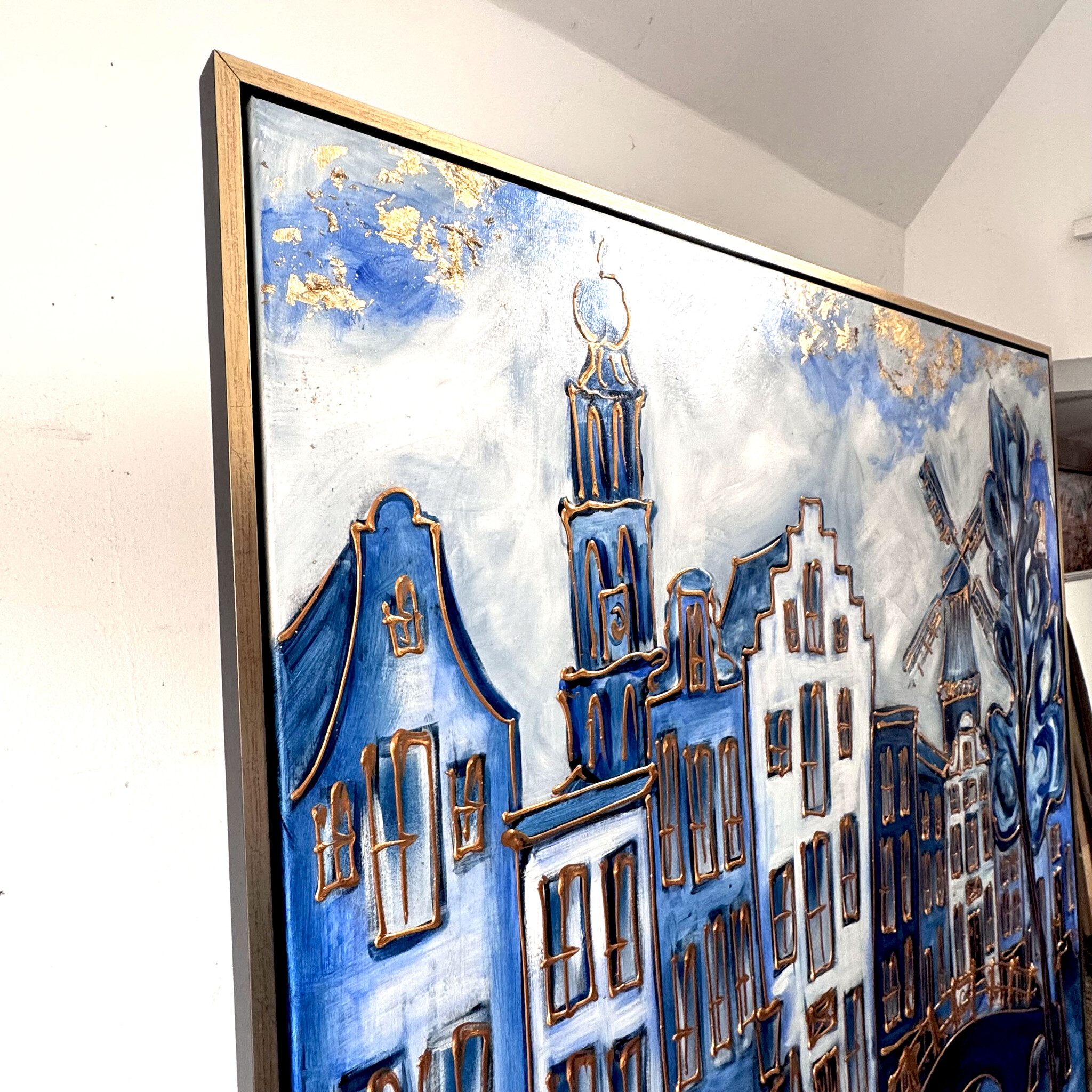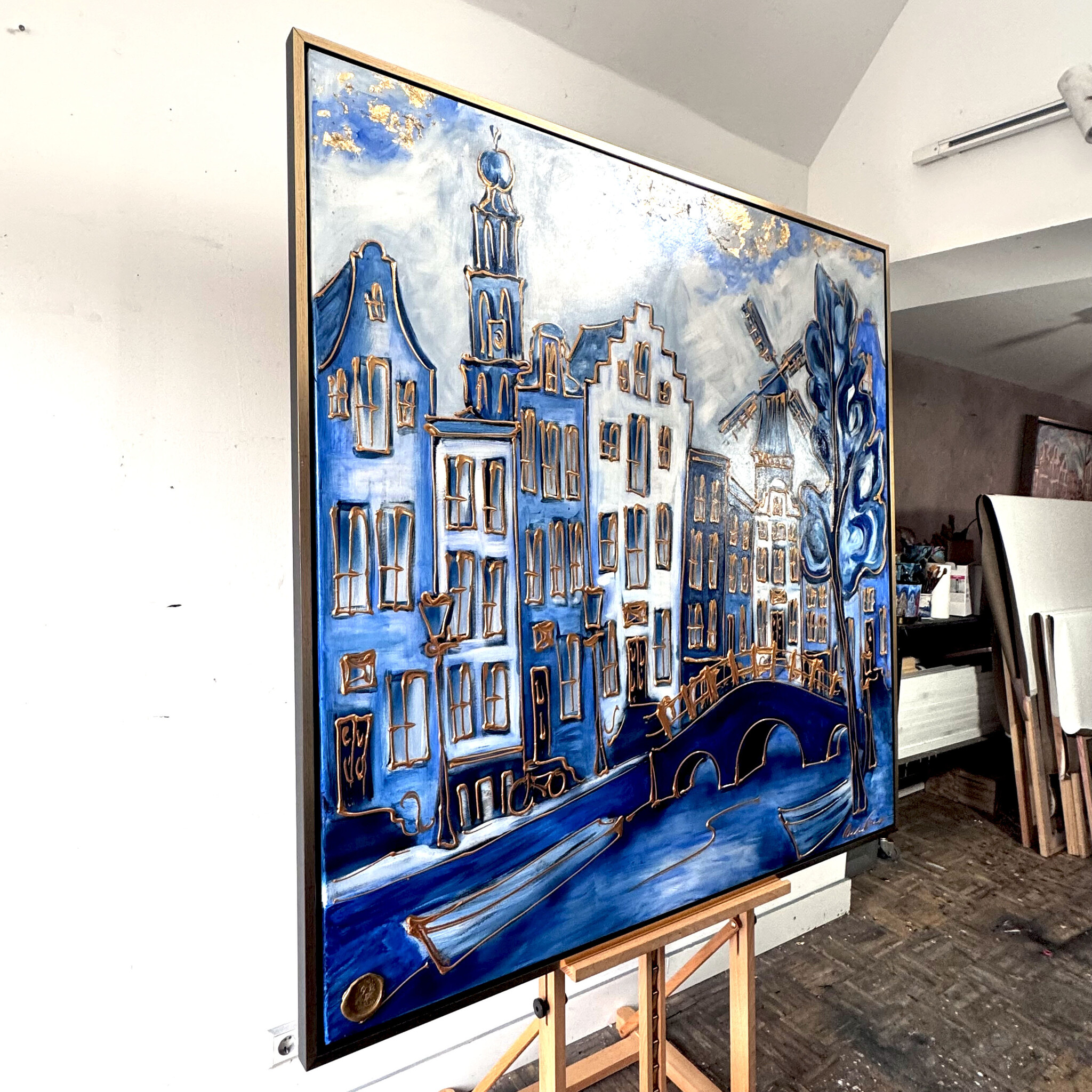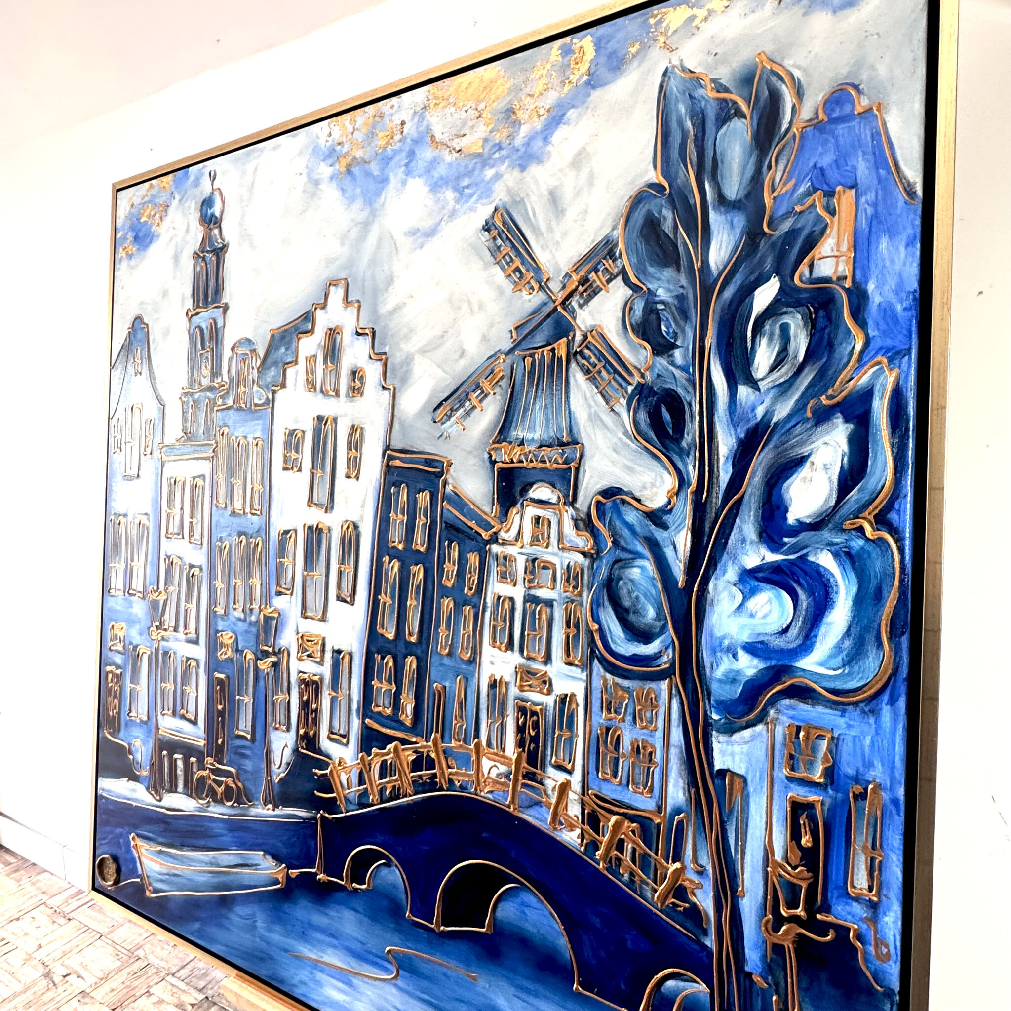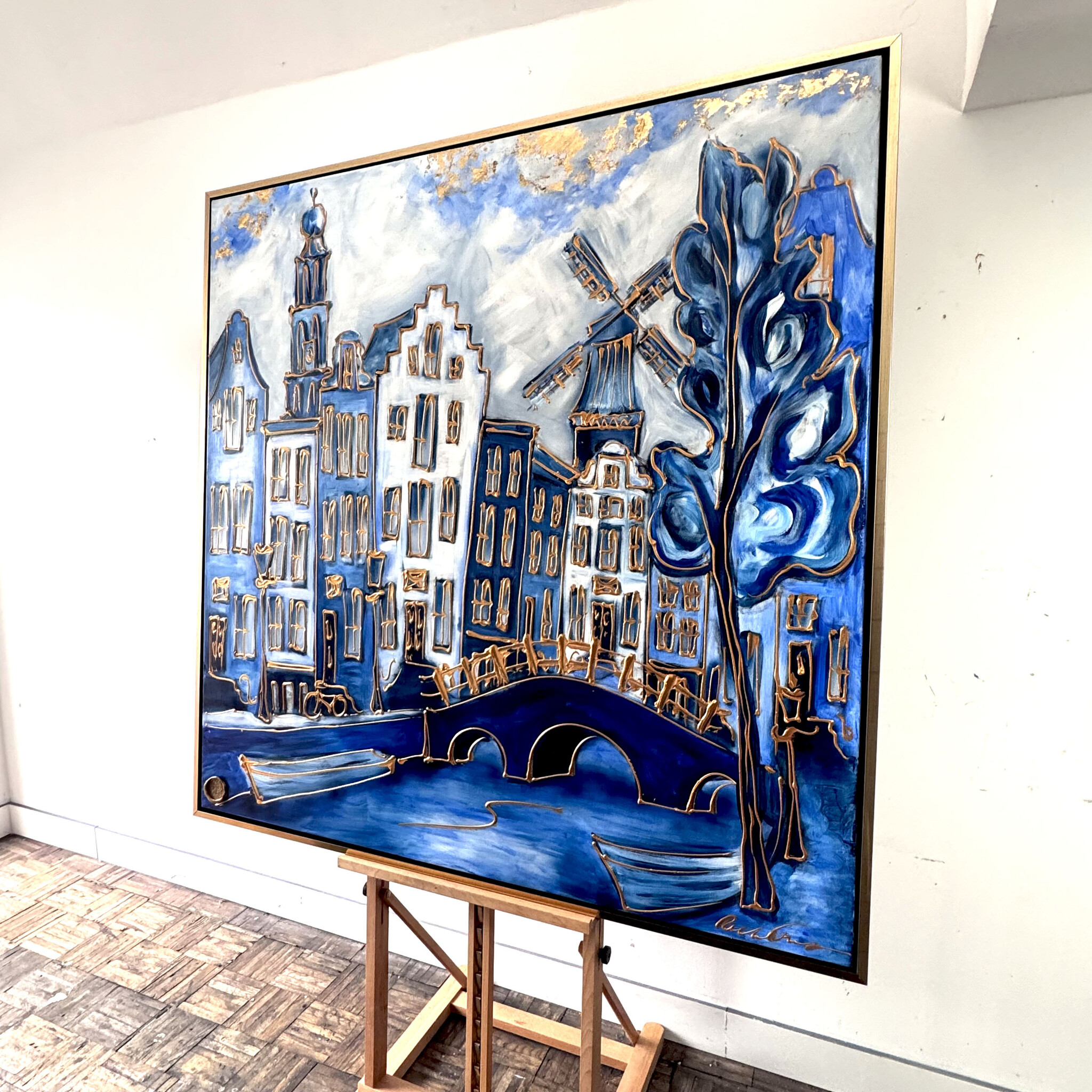 Schilderij- 140x140x2,5cm - Amsterdam in delft blauw met Goud - XXL