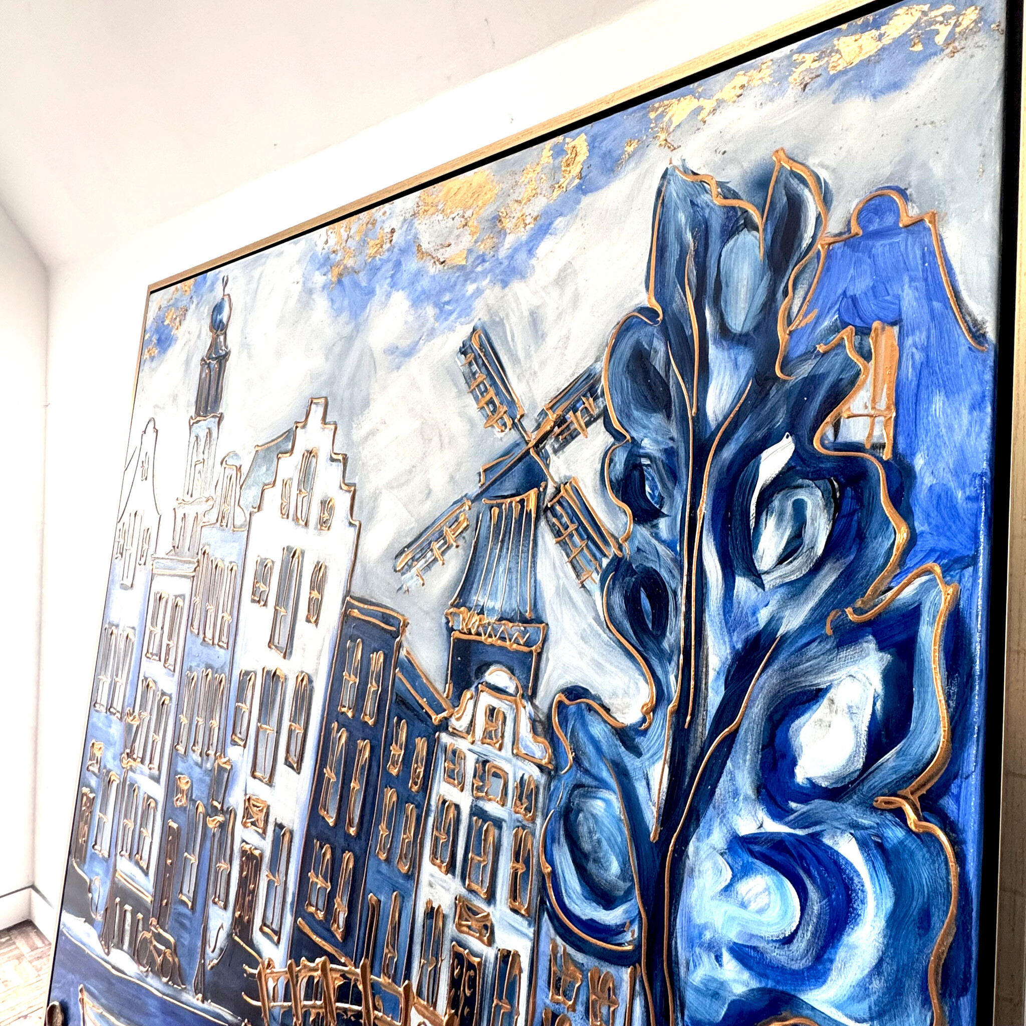 Artist Note: Mijn werken in de Amsterdam serie, zijn gemaakt in diverse lagen acryl verf, geïnspireerd op de glacis techniek van Rembrandt. Ook zo zichtbaar is de frottis techniek van de droge kwast in combinatie met in Parijs gekocht oliepastels van Sennelier (bekend van Picasso). Ook is de vrije tekenstijl, die ik opzet met houtskool, zeer kenmerkend. Elke laag van het werk ligt bloot door deze gemengde technieken.