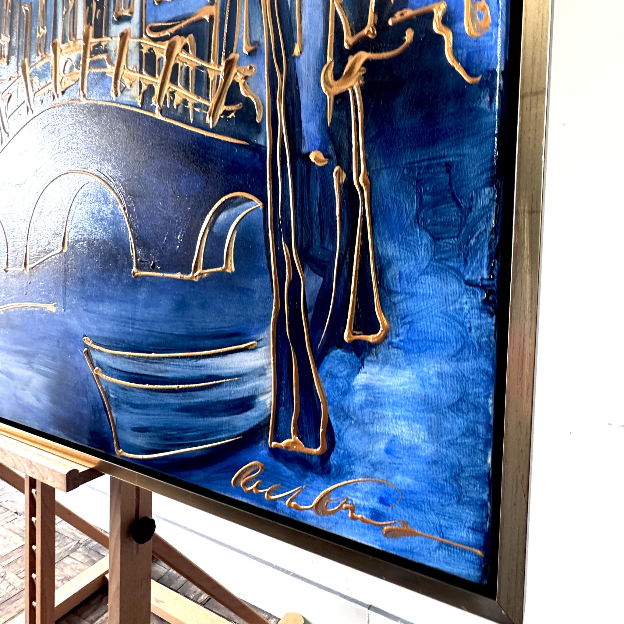 Rick bouwt zijn Amsterdam schilderijen op uit dikke lagen verf en werkt met een duidelijk handschrift wat zijn signatuur vormt. De dikke gouden lijn tekening waarmee zijn werk wordt afgemaakt doet de kijker al snel denken aan Amsterdam in de gouden eeuw.