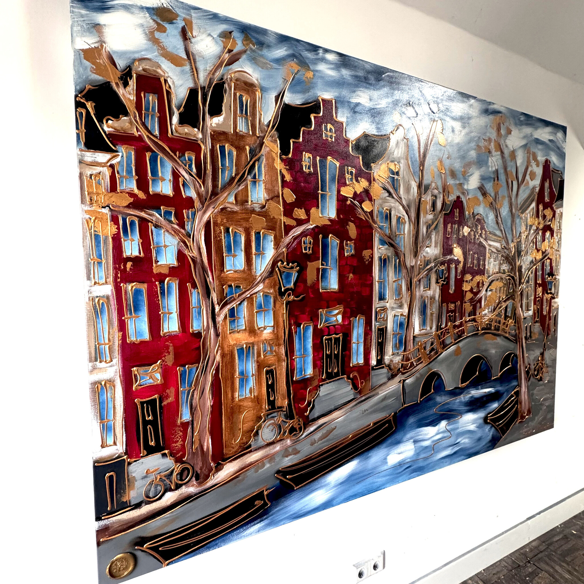 Artist Note: Mijn werken in de Amsterdam serie, zijn gemaakt in diverse lagen acryl verf, geïnspireerd op de glacis techniek van Rembrandt. Ook zo zichtbaar is de frottis techniek van de droge kwast in combinatie met in Parijs gekocht oliepastels van Sennelier (bekend van Picasso). Ook is de vrije tekenstijl, die ik opzet met houtskool, zeer kenmerkend. Elke laag van het werk ligt bloot door deze gemengde technieken.