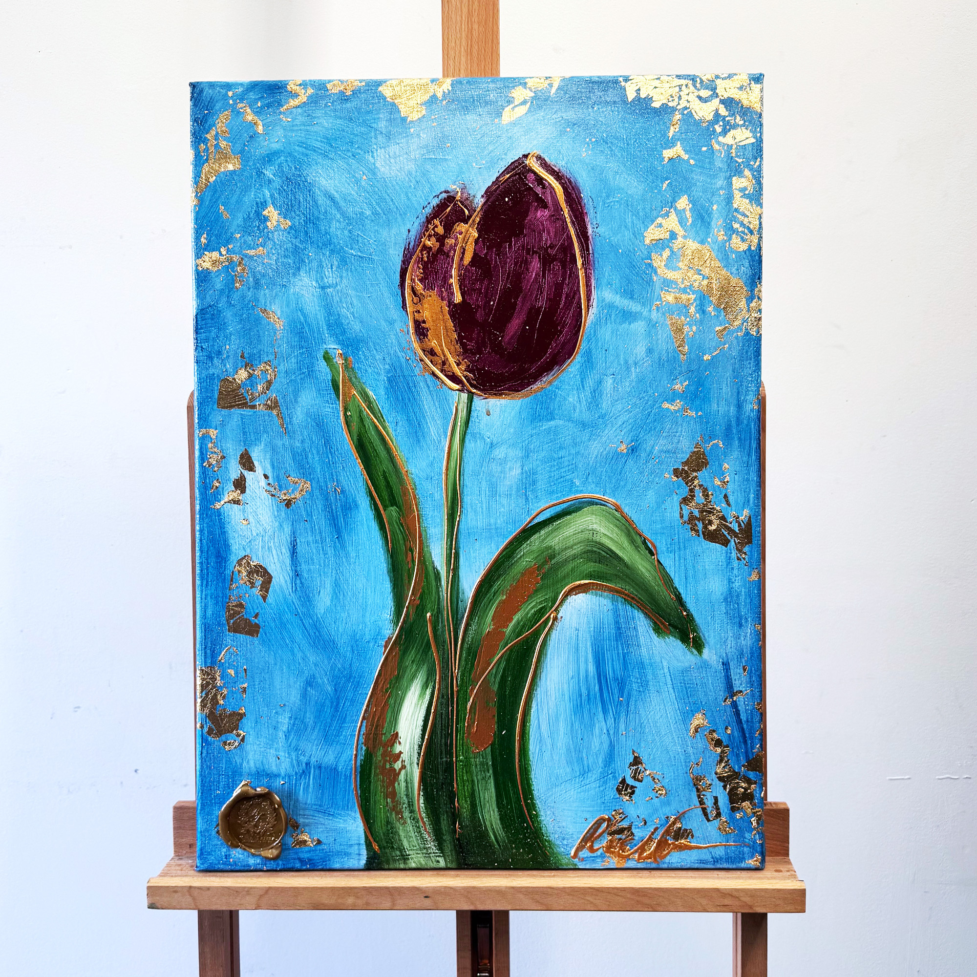 Artist Note: Mijn werken in de Serie Tulp Mania, zijn gemaakt in diverse lagen acryl verf, geïnspireerd op de glacis techniek van Rembrandt. Ook zo zichtbaar is de frottis techniek van de droge kwast in combinatie met in Parijs gekocht oliepastels van Sennelier. Ook is de vrije tekenstijl van de tulpen, die ik opzet met houtskool, zeer kenmerkend. Elke laag van het werk ligt bloot door deze gemengde technieken.