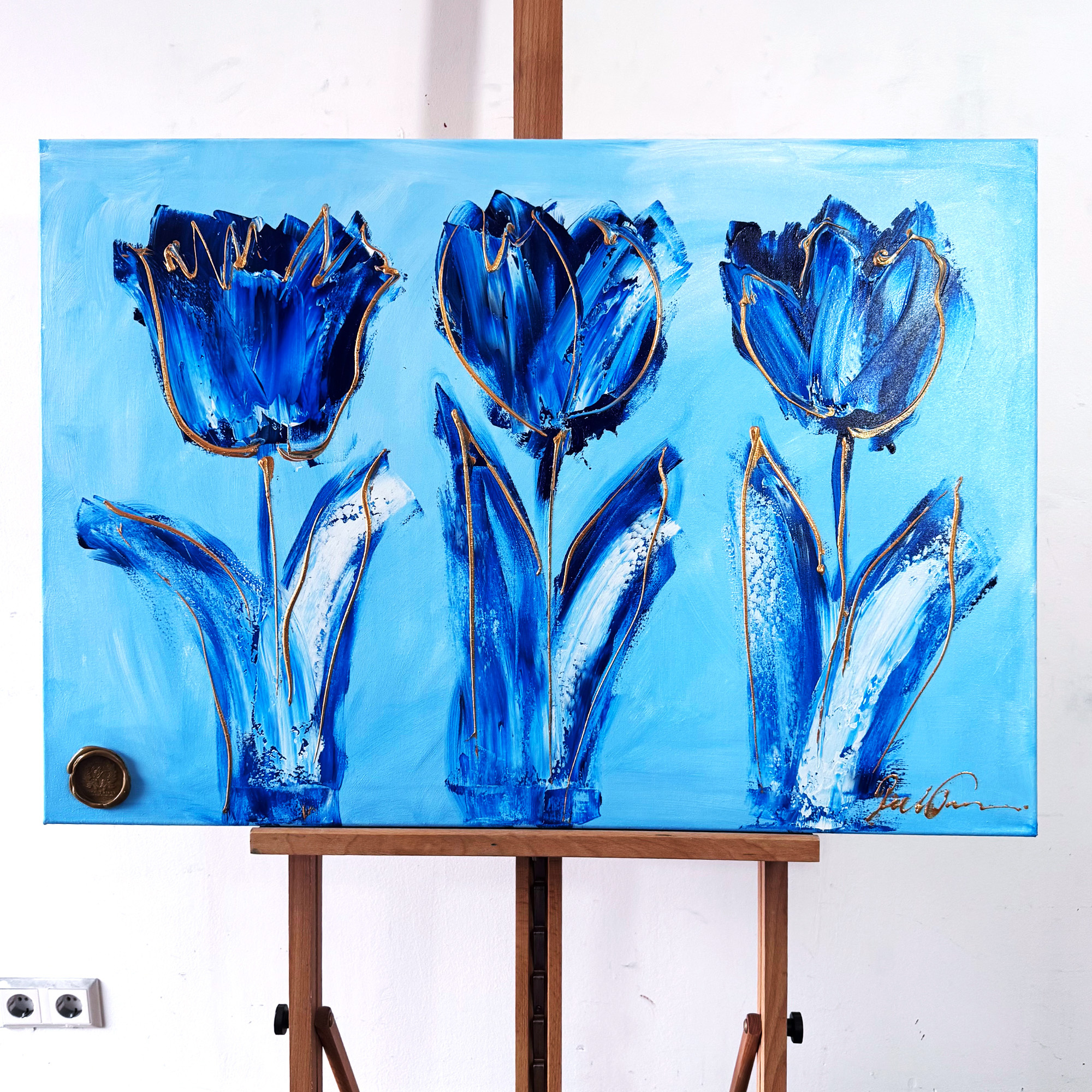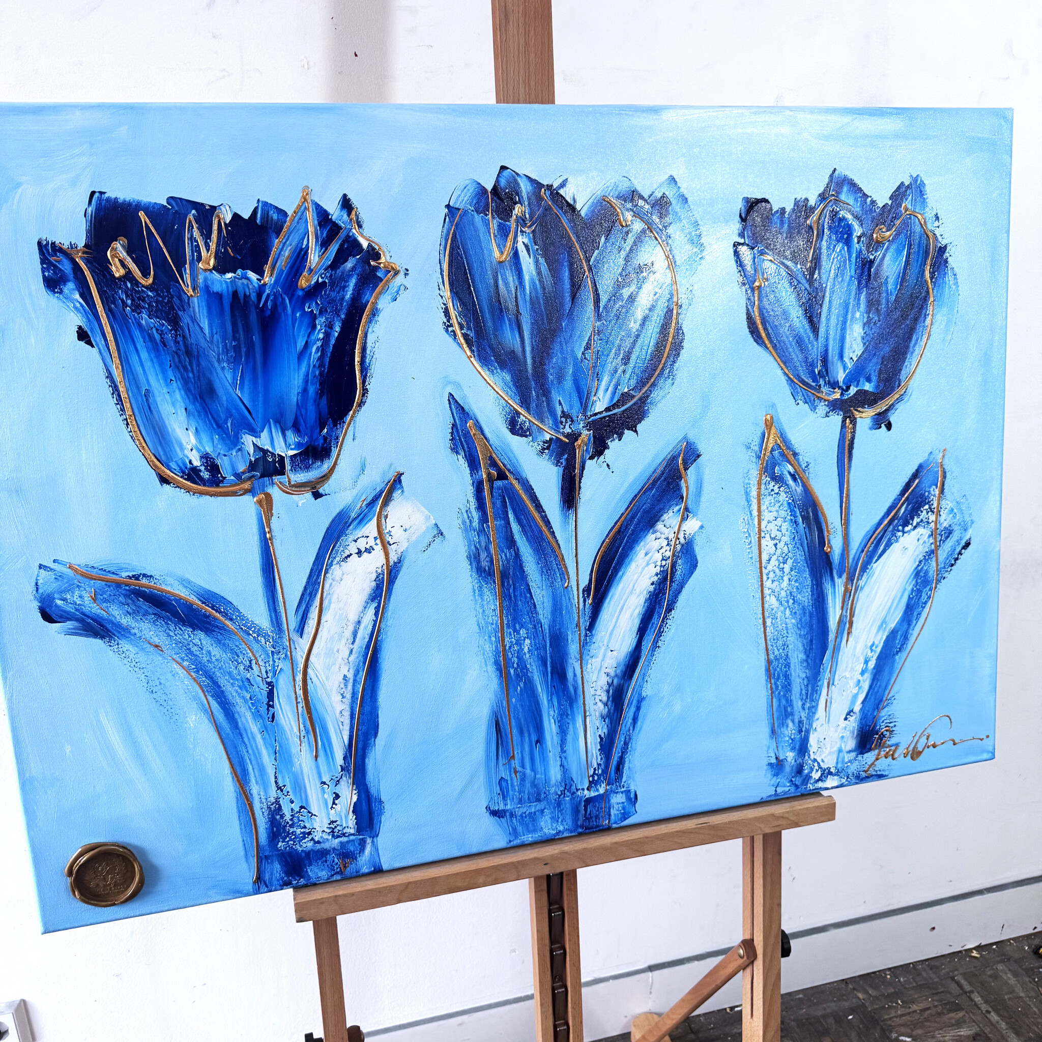 Artist Note: Mijn werken in de Serie Tulp Mania, zijn gemaakt in diverse lagen acryl verf, geïnspireerd op de glacis techniek van Rembrandt. Ook zo zichtbaar is de frottis techniek van de droge kwast in combinatie met in Parijs gekocht oliepastels van Sennelier. Ook is de vrije tekenstijl van de tulpen, die ik opzet met houtskool, zeer kenmerkend. Elke laag van het werk ligt bloot door deze gemengde technieken.
