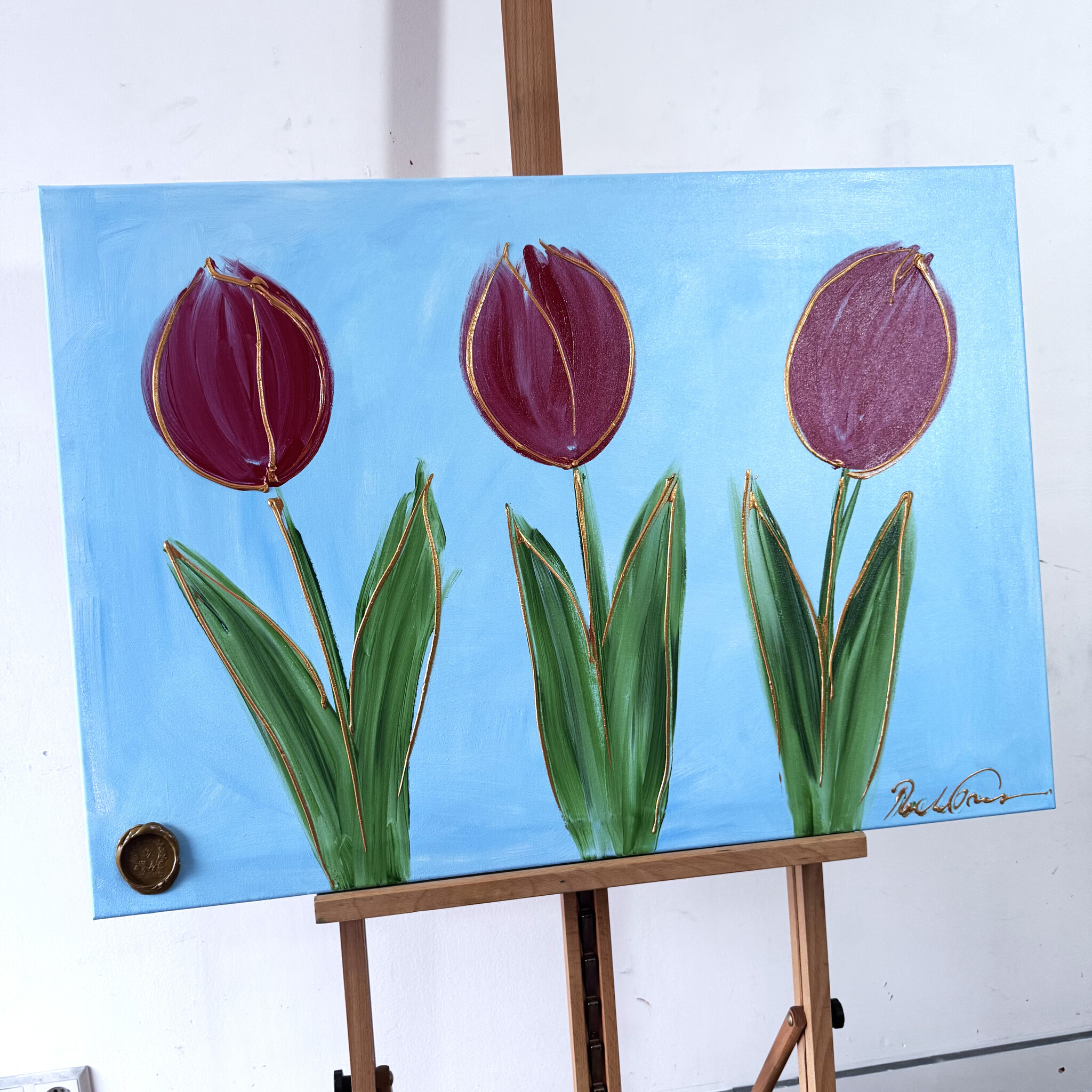 Artist Note: Mijn werken in de Serie Tulp Mania, zijn gemaakt in diverse lagen acryl verf, geïnspireerd op de glacis techniek van Rembrandt. Ook zo zichtbaar is de frottis techniek van de droge kwast in combinatie met in Parijs gekocht oliepastels van Sennelier. Ook is de vrije tekenstijl van de tulpen, die ik opzet met houtskool, zeer kenmerkend. Elke laag van het werk ligt bloot door deze gemengde technieken.
