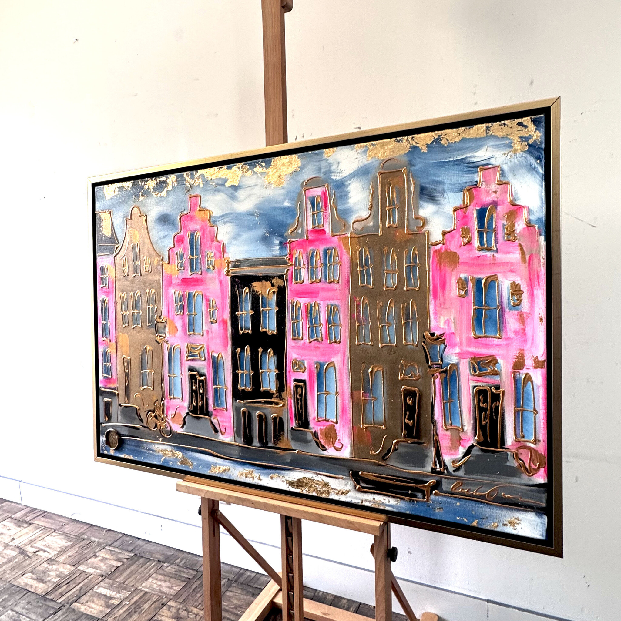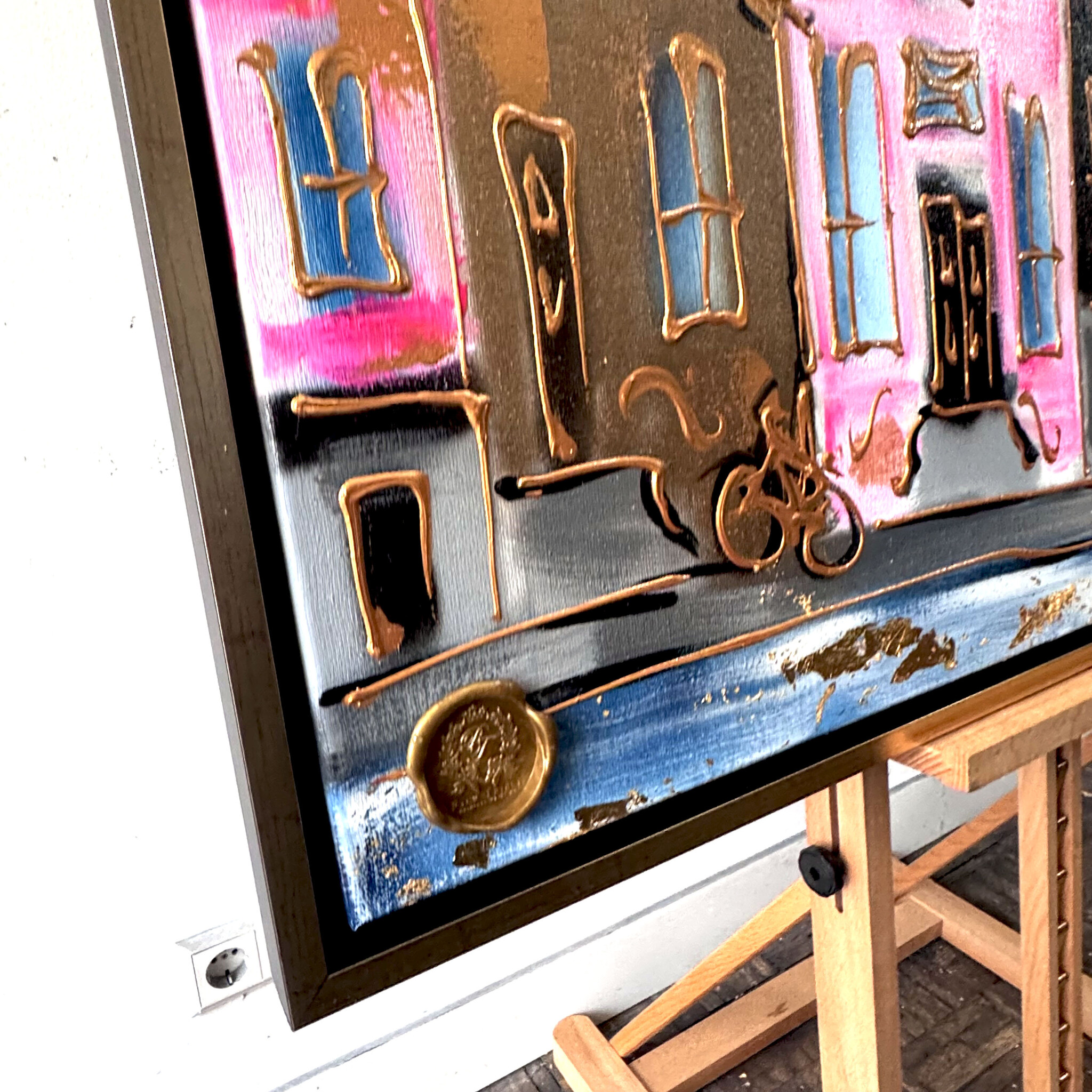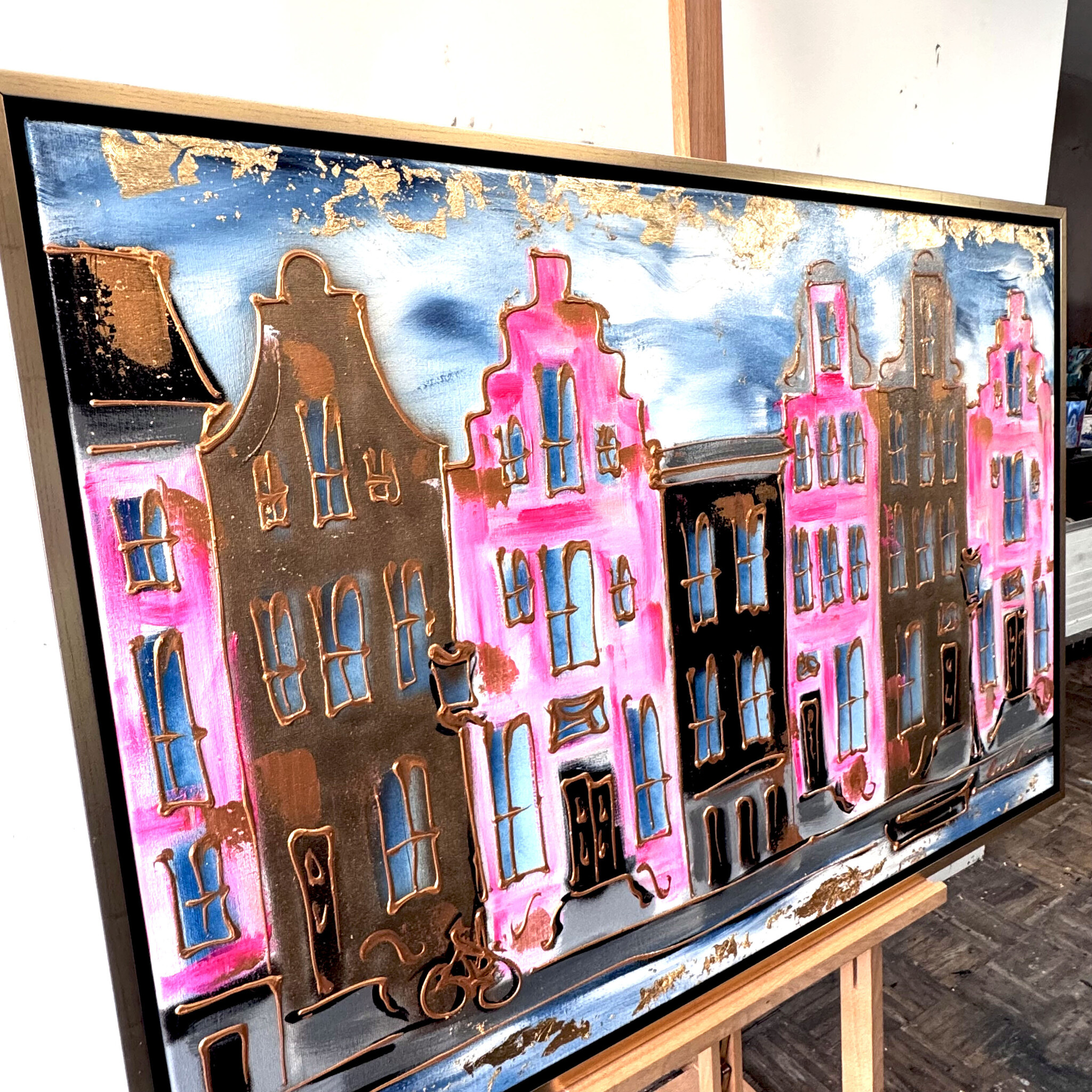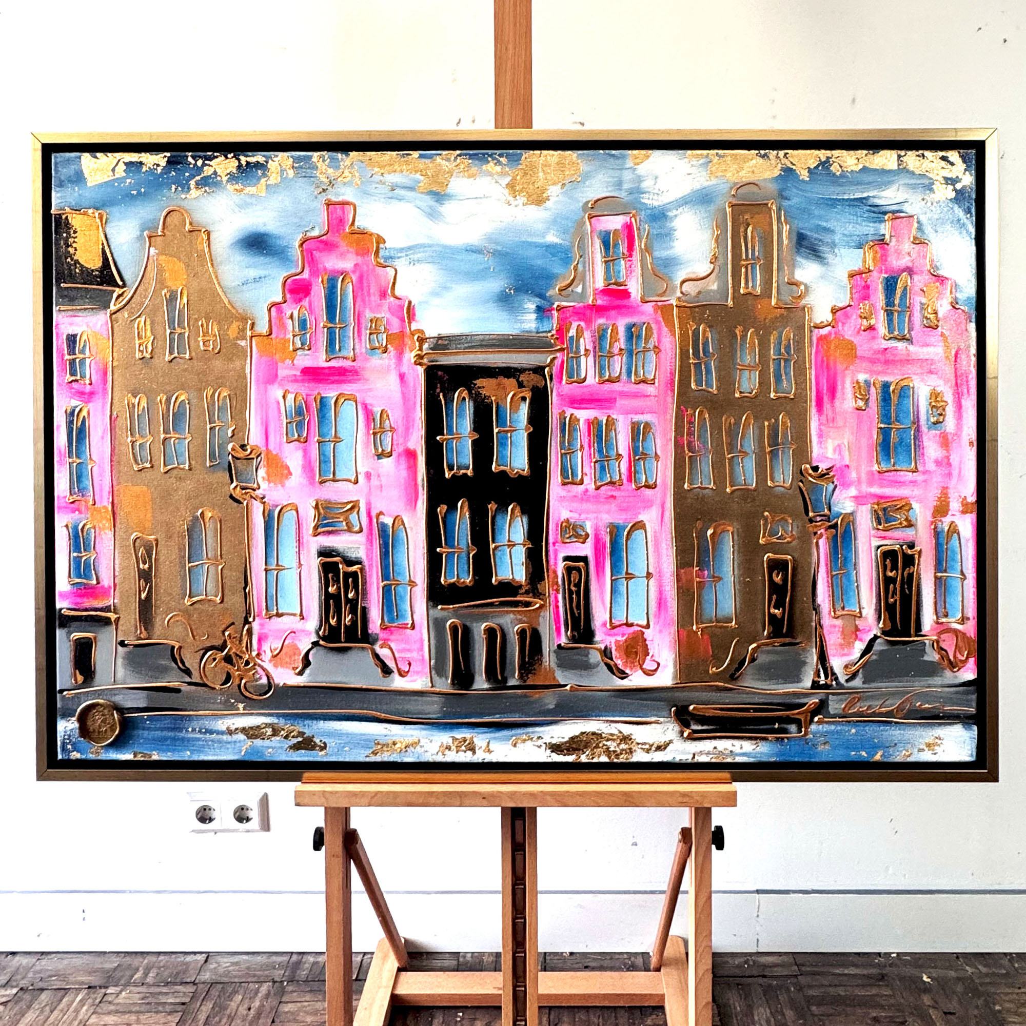 Artist Note: Mijn werken in de Amsterdam serie, zijn gemaakt in diverse lagen acryl verf, geïnspireerd op de glacis techniek van Rembrandt. Ook zo zichtbaar is de frottis techniek van de droge kwast in combinatie met in Parijs gekocht oliepastels van Sennelier (bekend van Picasso). Ook is de vrije tekenstijl, die ik opzet met houtskool, zeer kenmerkend. Elke laag van het werk ligt bloot door deze gemengde technieken.