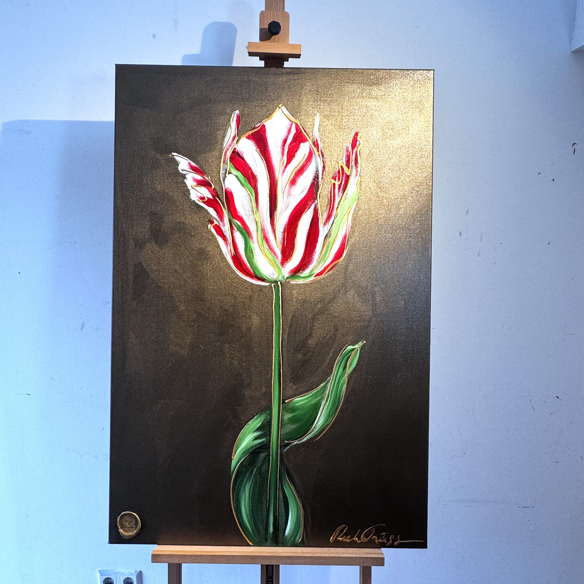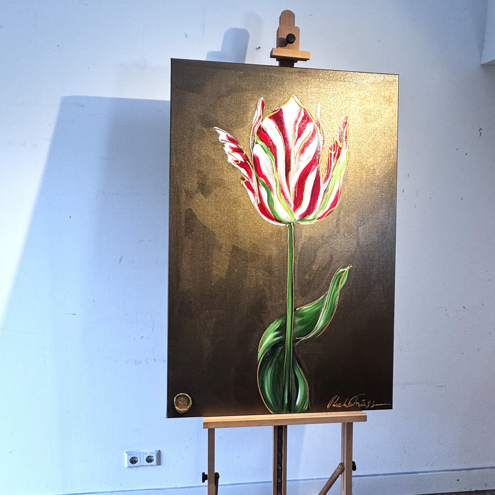 Rick bouwt de tulpen schilderijen op uit dikke lagen verf en werkt met een duidelijk handschrift wat zijn signatuur vormt. De dikke gouden lijn tekening waarmee zijn werk wordt afgemaakt doet de kijker al snel denken aan Amsterdam & Nederland in de gouden eeuw.