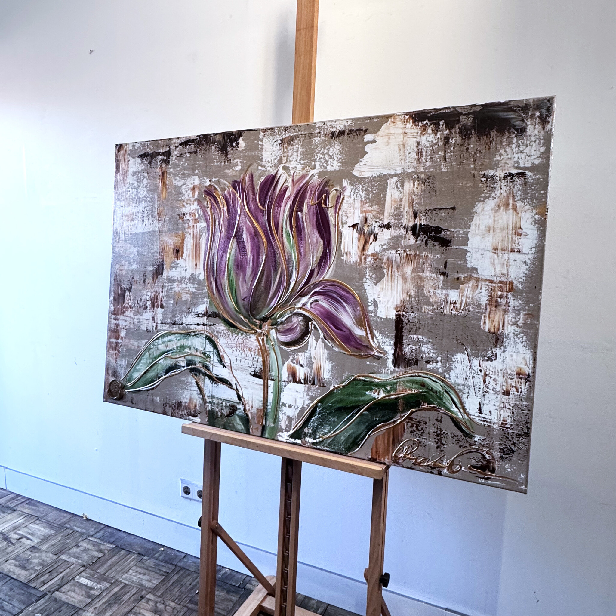 Artist Note: Mijn werken in de Serie Tulp Mania, zijn gemaakt in diverse lagen acryl verf, geïnspireerd op de glacis techniek van Rembrandt. Ook zo zichtbaar is de frottis techniek van de droge kwast in combinatie met in Parijs gekocht oliepastels van Sennelier. Ook is de vrije tekenstijl van de tulpen, die ik opzet met houtskool, zeer kenmerkend. Elke laag van het werk ligt bloot door deze gemengde technieken.