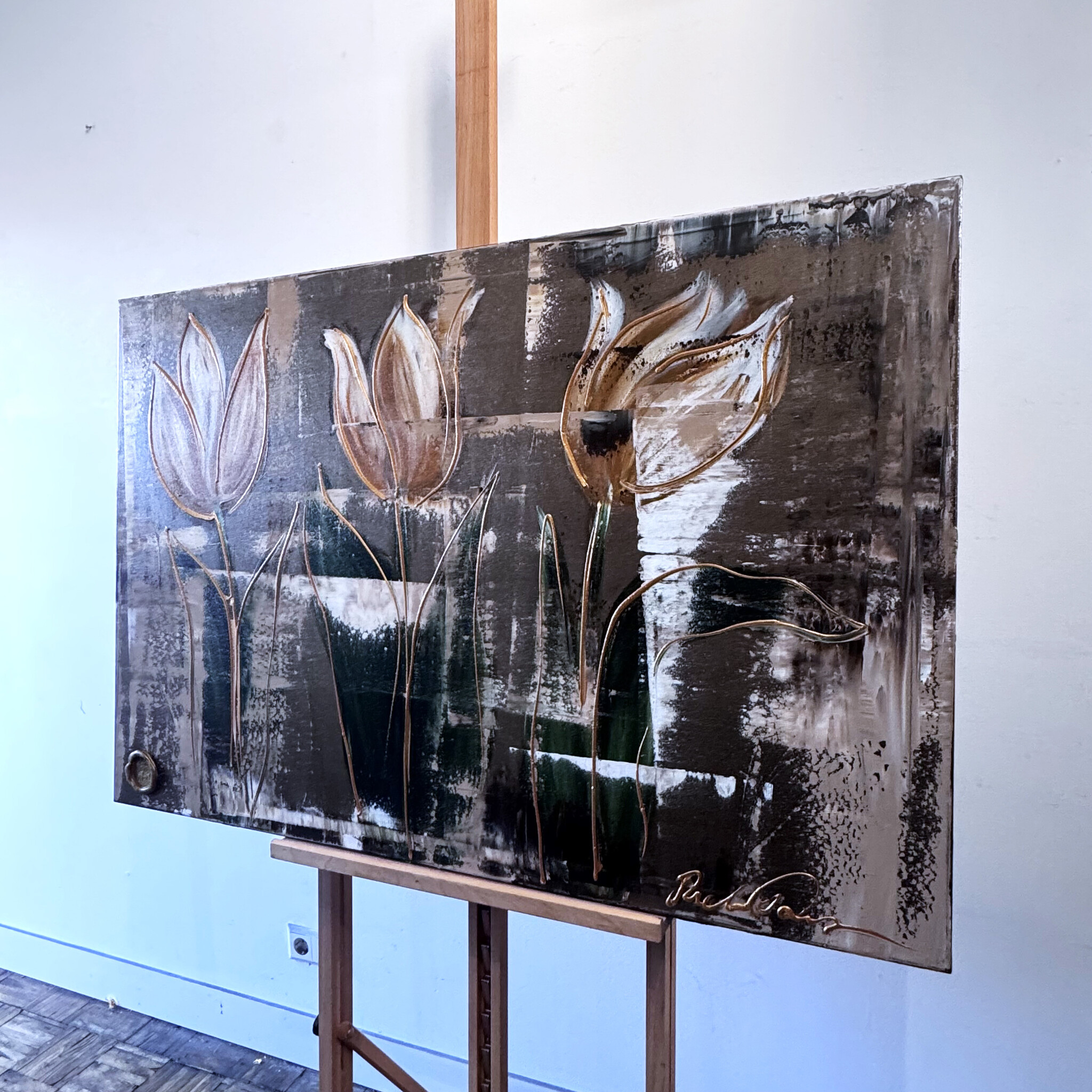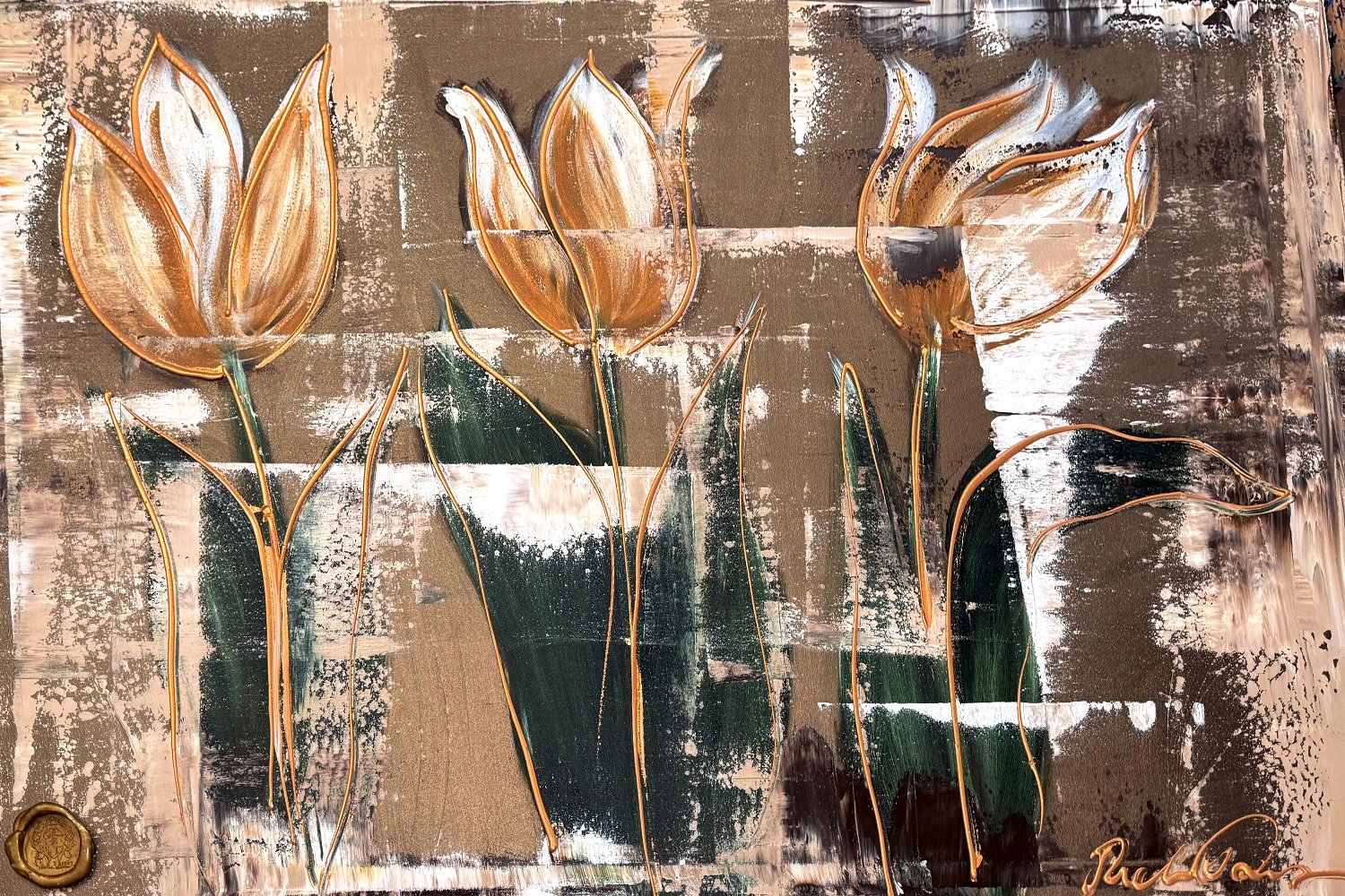 Rick bouwt de tulpen schilderijen op uit dikke lagen verf en werkt met een duidelijk handschrift wat zijn signatuur vormt. De dikke gouden lijn tekening waarmee zijn werk wordt afgemaakt doet de kijker al snel denken aan Amsterdam & Nederland in de gouden eeuw.