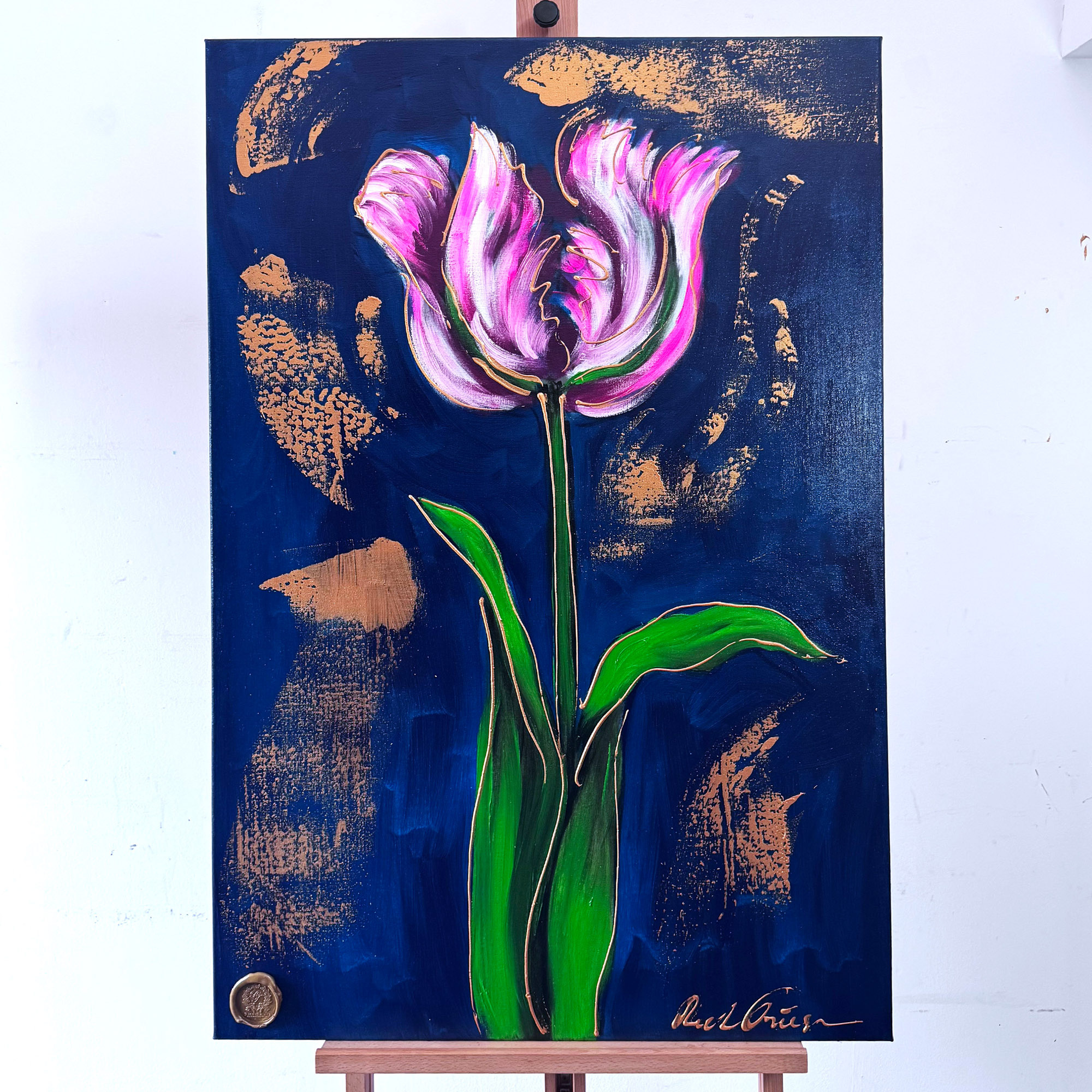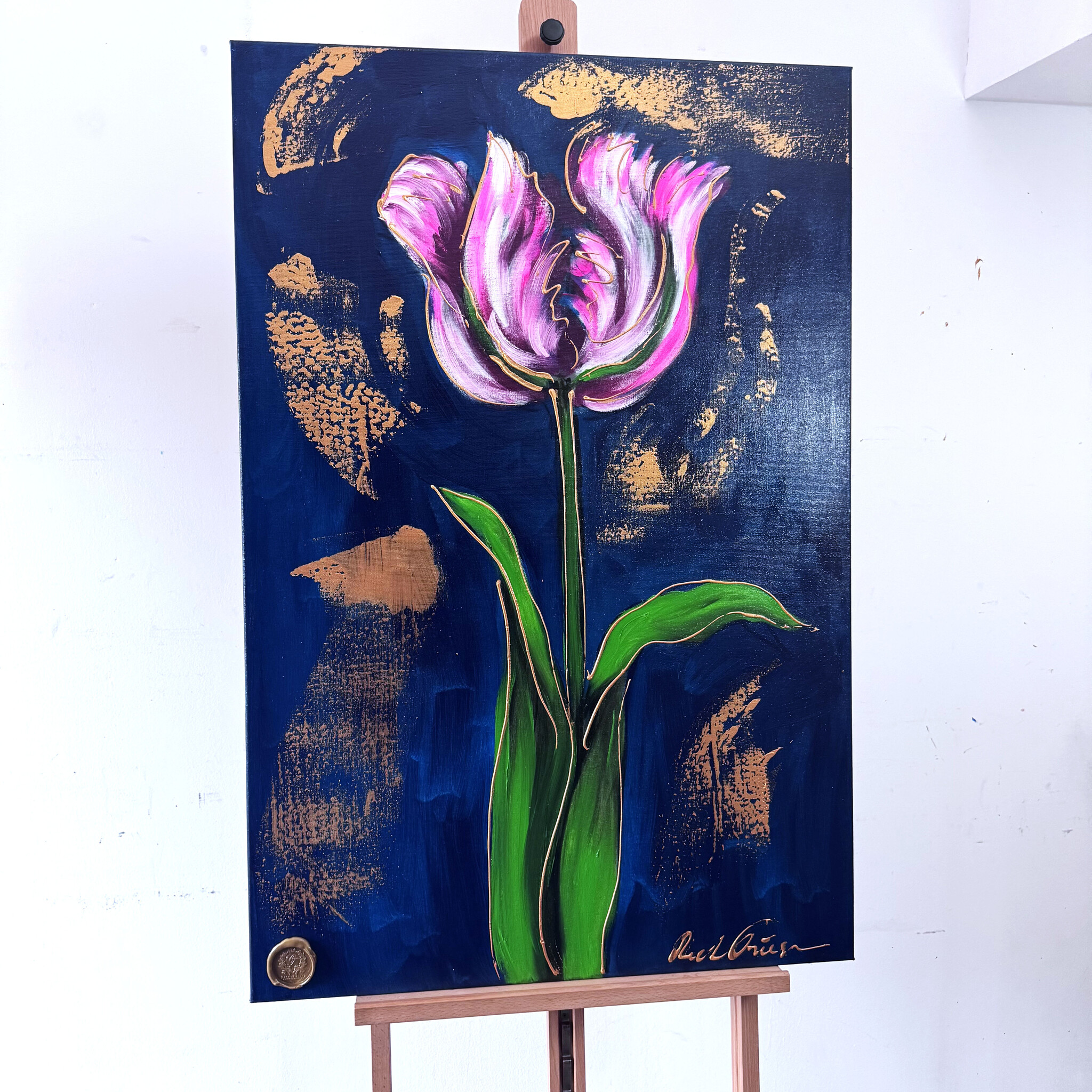 Artist Note: Mijn werken in de Serie Tulp Mania, zijn gemaakt in diverse lagen acryl verf, geïnspireerd op de glacis techniek van Rembrandt. Ook zo zichtbaar is de frottis techniek van de droge kwast in combinatie met in Parijs gekocht oliepastels van Sennelier. Ook is de vrije tekenstijl van de tulpen, die ik opzet met houtskool, zeer kenmerkend. Elke laag van het werk ligt bloot door deze gemengde technieken.