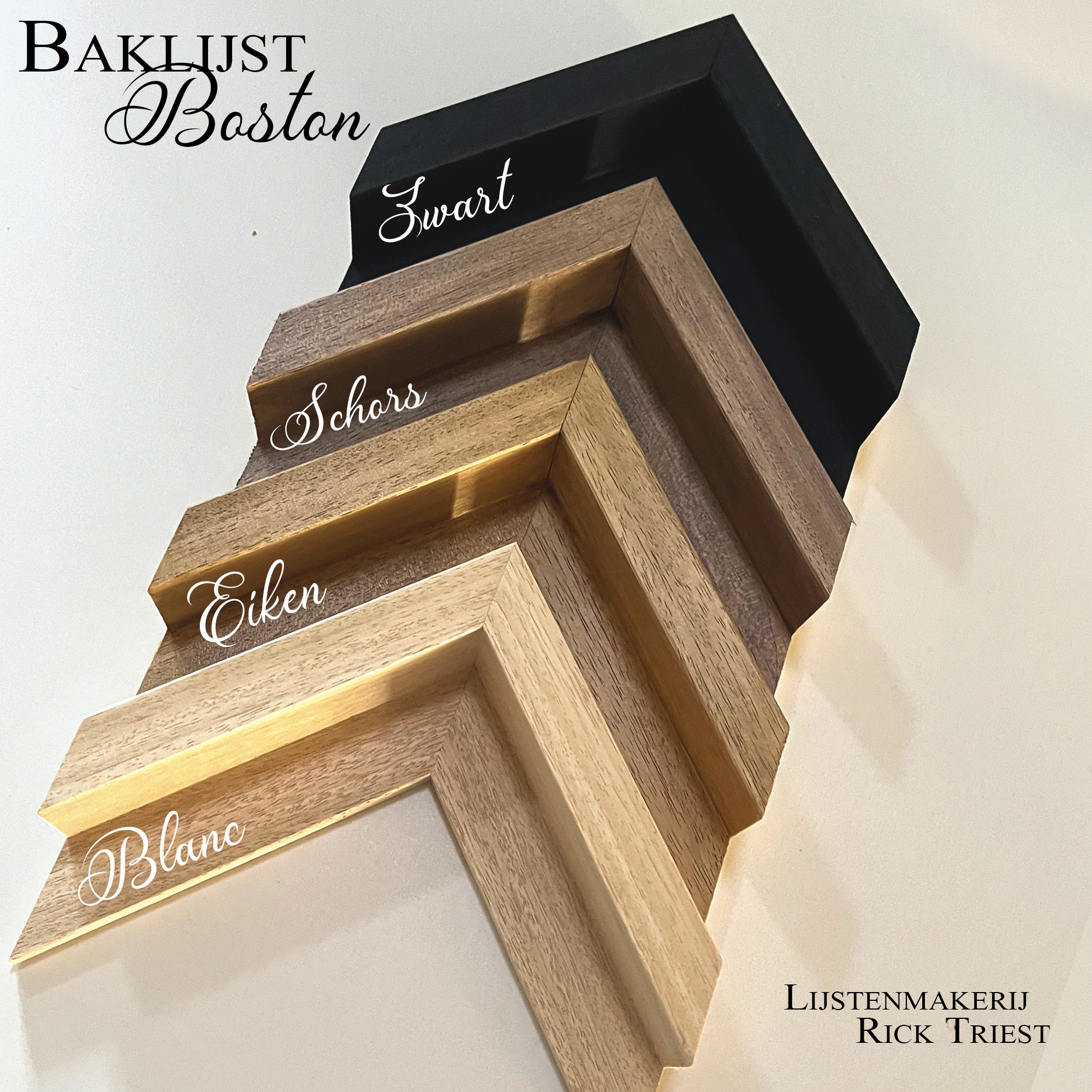 Naast Rick zijn Atelier & Gallery, heeft hij een apart ingerichte ruimte waar hij zijn eigen lijsten maakt en zijn werk inlijst. Met professionele apparatuur worden de lijsten zorgvuldig met de hand gemaakt. In het atelier zijn alle beschikbare lijsten te bekijken. De levertijd van een lijst bedraagt ca. 14 dagen.