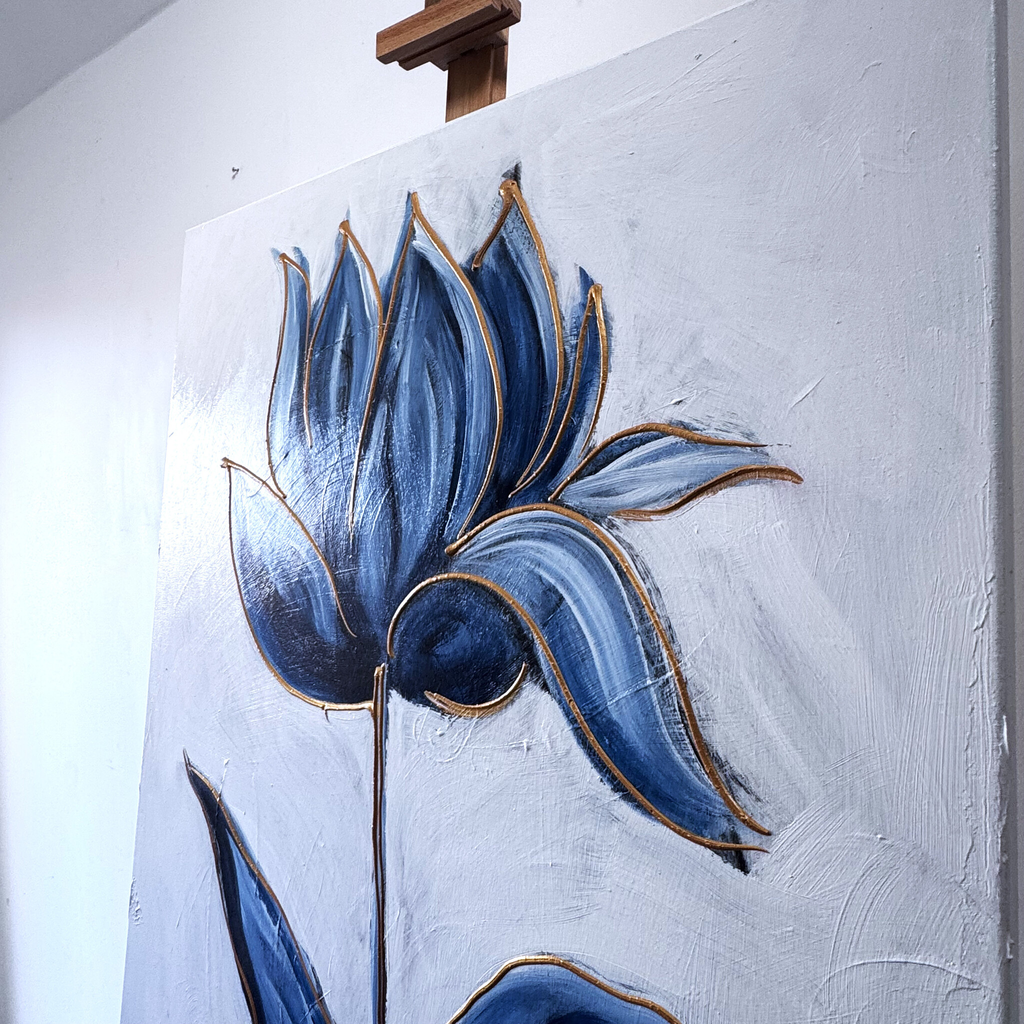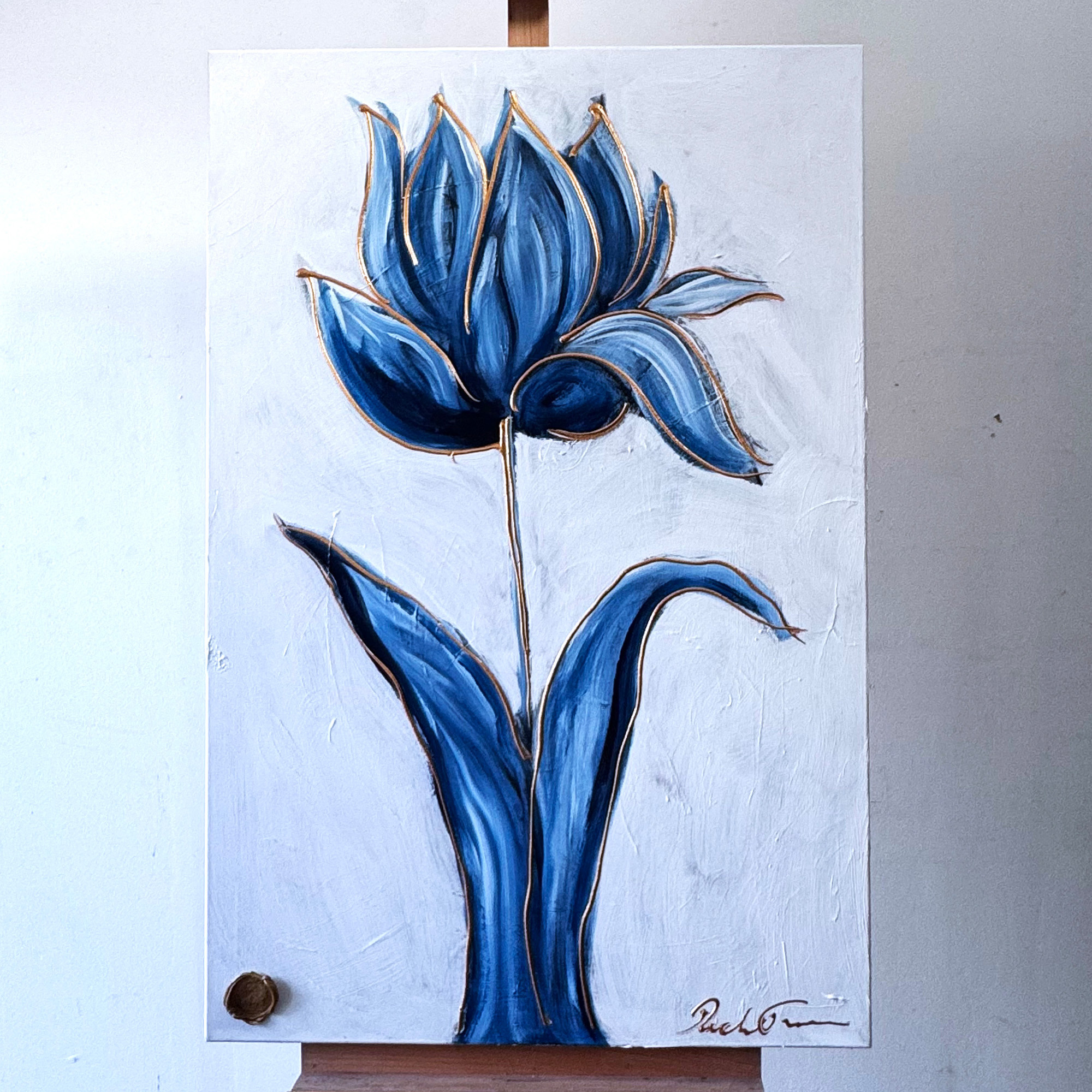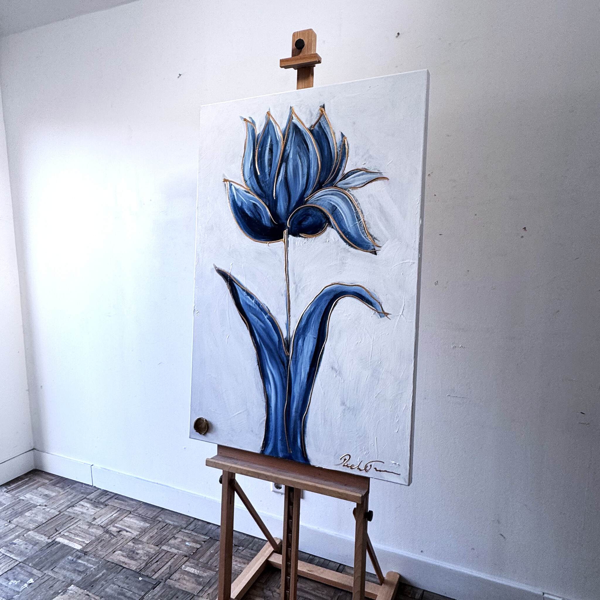 Schilderij - 80x120 cm - Rick Triest - XL delft tulp - Blue and gold - 4,5cm dik