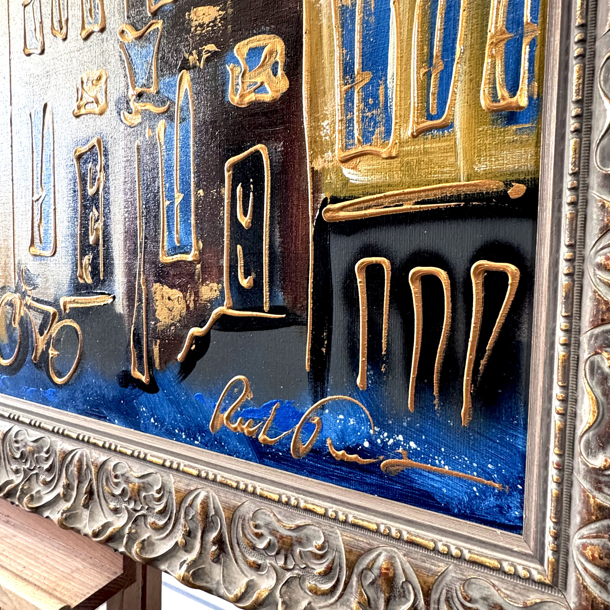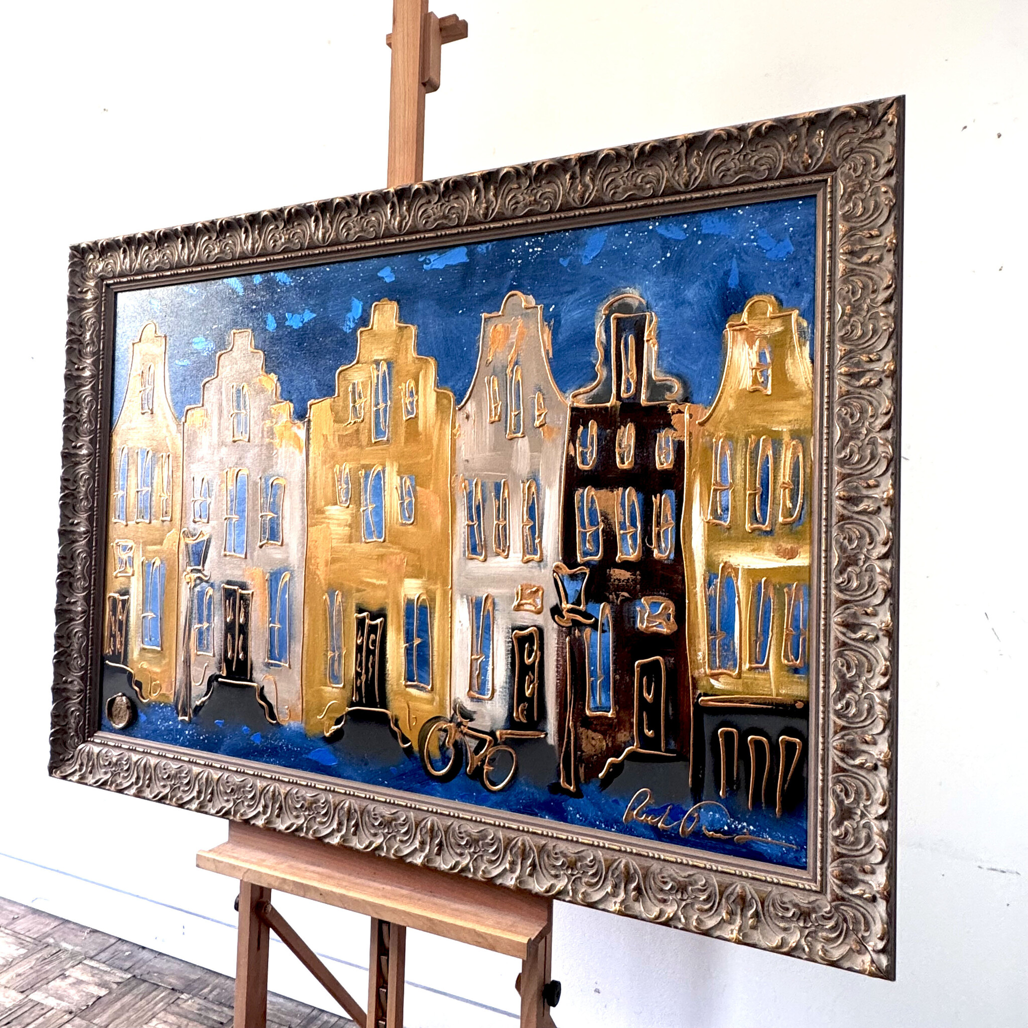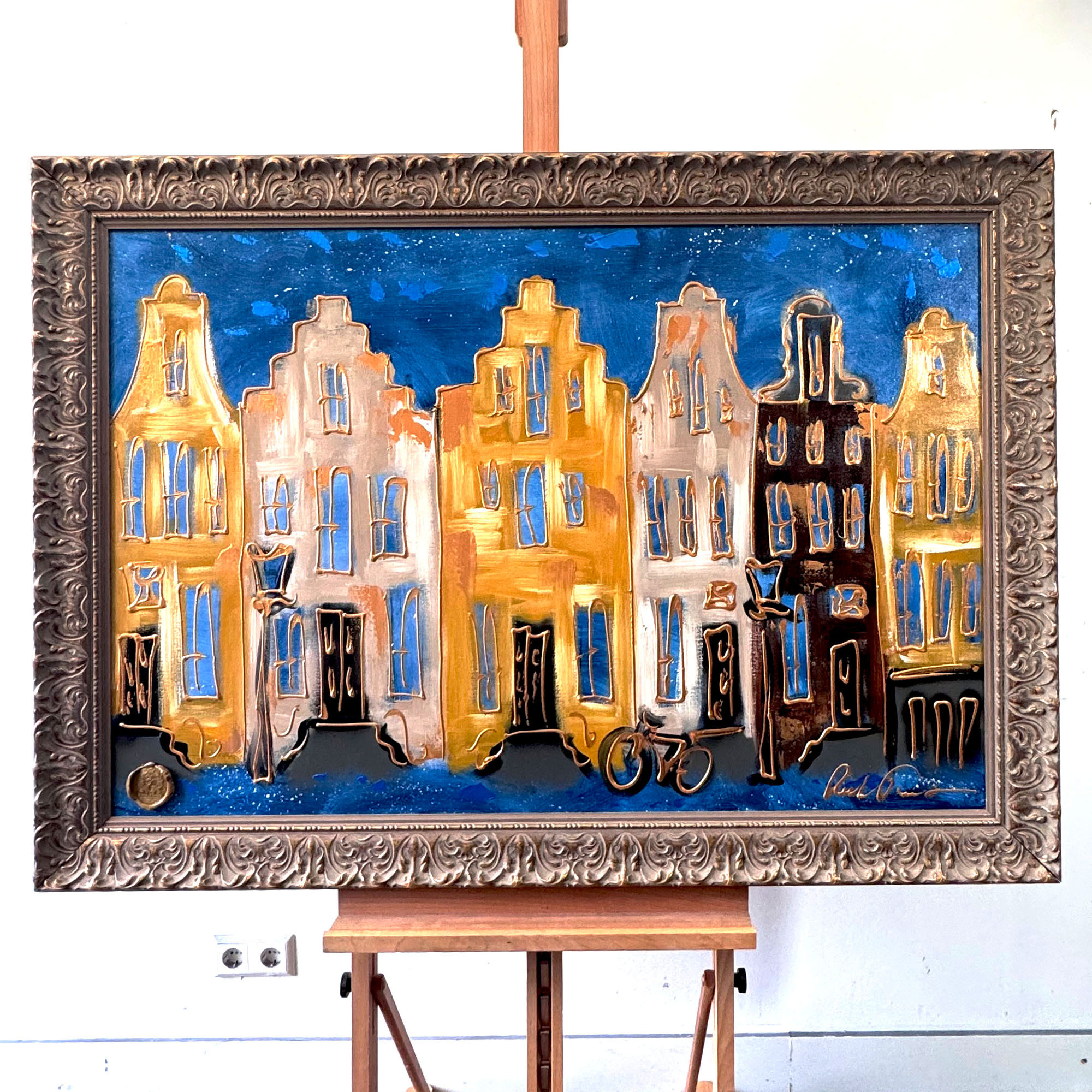 Rick bouwt zijn Amsterdam schilderijen op uit dikke lagen verf en werkt met een duidelijk handschrift wat zijn signatuur vormt. De dikke gouden lijn tekening waarmee zijn werk wordt afgemaakt doet de kijker al snel denken aan Amsterdam in de gouden eeuw.