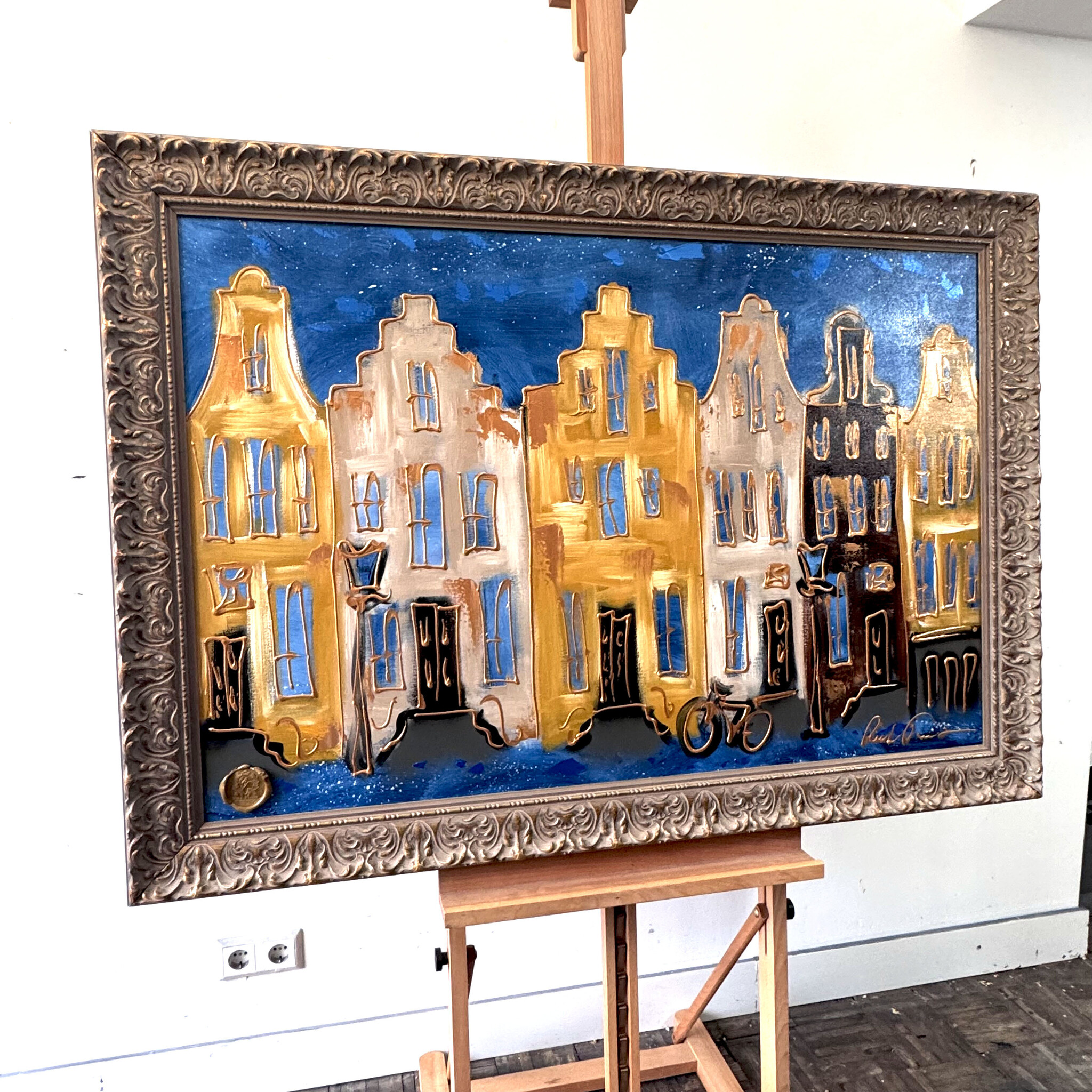 Artist Note: Mijn werken in de Amsterdam serie, zijn gemaakt in diverse lagen acryl verf, geïnspireerd op de glacis techniek van Rembrandt. Ook zo zichtbaar is de frottis techniek van de droge kwast in combinatie met in Parijs gekocht oliepastels van Sennelier (bekend van Picasso). Ook is de vrije tekenstijl, die ik opzet met houtskool, zeer kenmerkend. Elke laag van het werk ligt bloot door deze gemengde technieken.