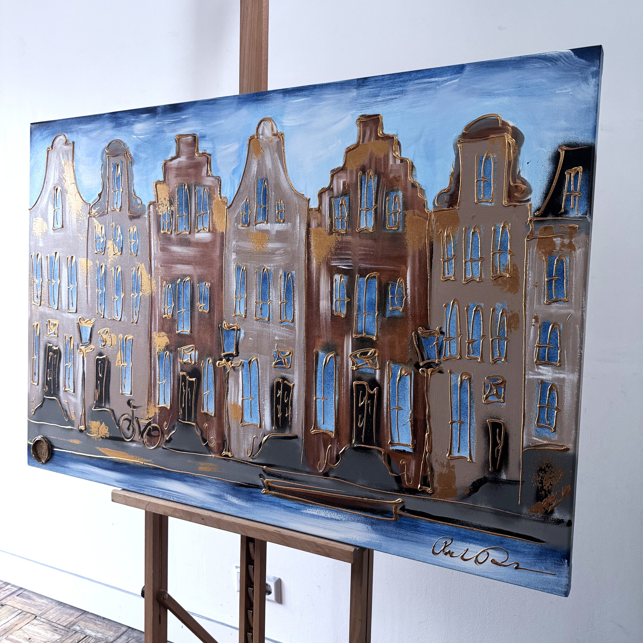 Rick bouwt zijn Amsterdam schilderijen op uit dikke lagen verf en werkt met een duidelijk handschrift wat zijn signatuur vormt. De dikke gouden lijn tekening waarmee zijn werk wordt afgemaakt doet de kijker al snel denken aan Amsterdam in de gouden eeuw.