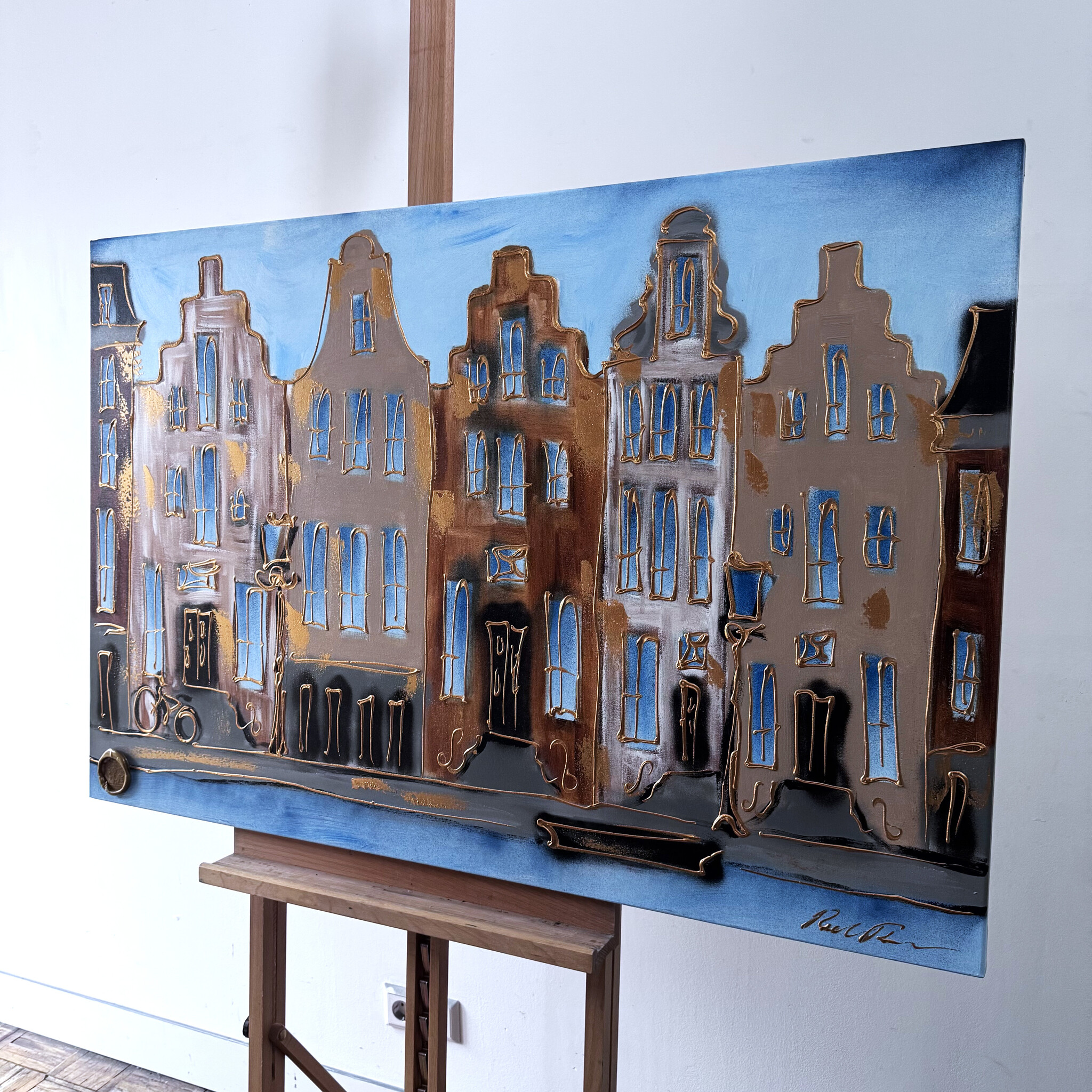 Rick bouwt zijn Amsterdam schilderijen op uit dikke lagen verf en werkt met een duidelijk handschrift wat zijn signatuur vormt. De dikke gouden lijn tekening waarmee zijn werk wordt afgemaakt doet de kijker al snel denken aan Amsterdam in de gouden eeuw.