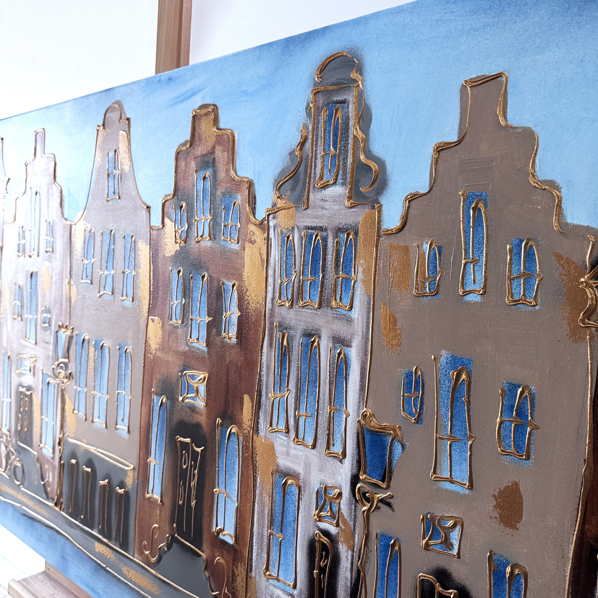 Artist Note: Mijn werken in de Amsterdam serie, zijn gemaakt in diverse lagen acryl verf, geïnspireerd op de glacis techniek van Rembrandt. Ook zo zichtbaar is de frottis techniek van de droge kwast in combinatie met in Parijs gekocht oliepastels van Sennelier (bekend van Picasso). Ook is de vrije tekenstijl, die ik opzet met houtskool, zeer kenmerkend. Elke laag van het werk ligt bloot door deze gemengde technieken.
