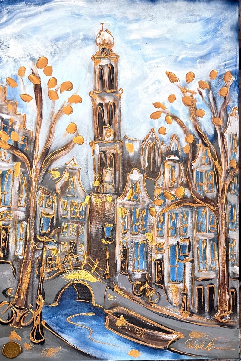 Rick bouwt zijn Amsterdam schilderijen op uit dikke lagen verf en werkt met een duidelijk handschrift wat zijn signatuur vormt. De dikke gouden lijn tekening waarmee zijn werk wordt afgemaakt doet de kijker al snel denken aan Amsterdam in de gouden eeuw.