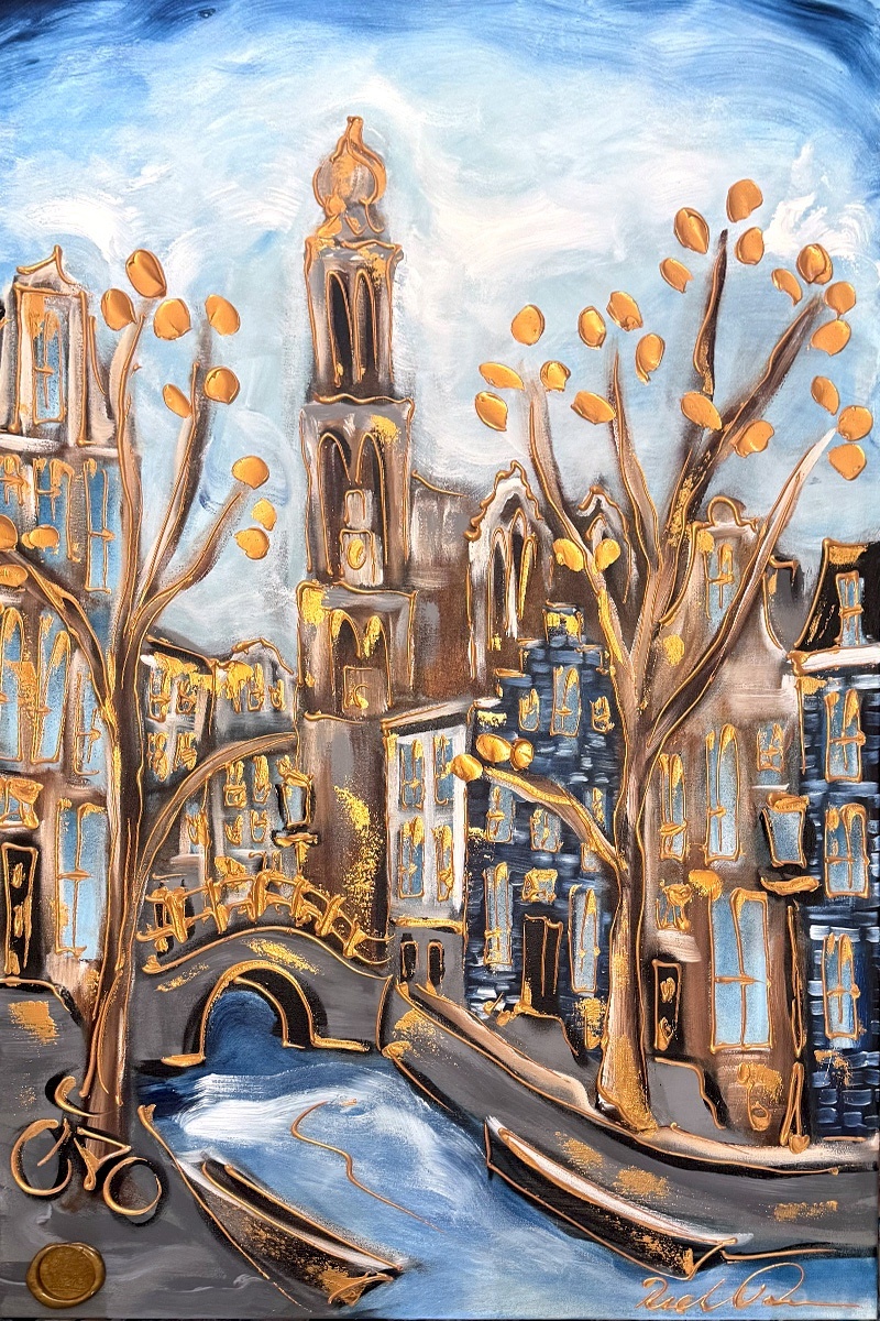 Rick bouwt zijn Amsterdam schilderijen op uit dikke lagen verf en werkt met een duidelijk handschrift wat zijn signatuur vormt. De dikke gouden lijn tekening waarmee zijn werk wordt afgemaakt doet de kijker al snel denken aan Amsterdam in de gouden eeuw.