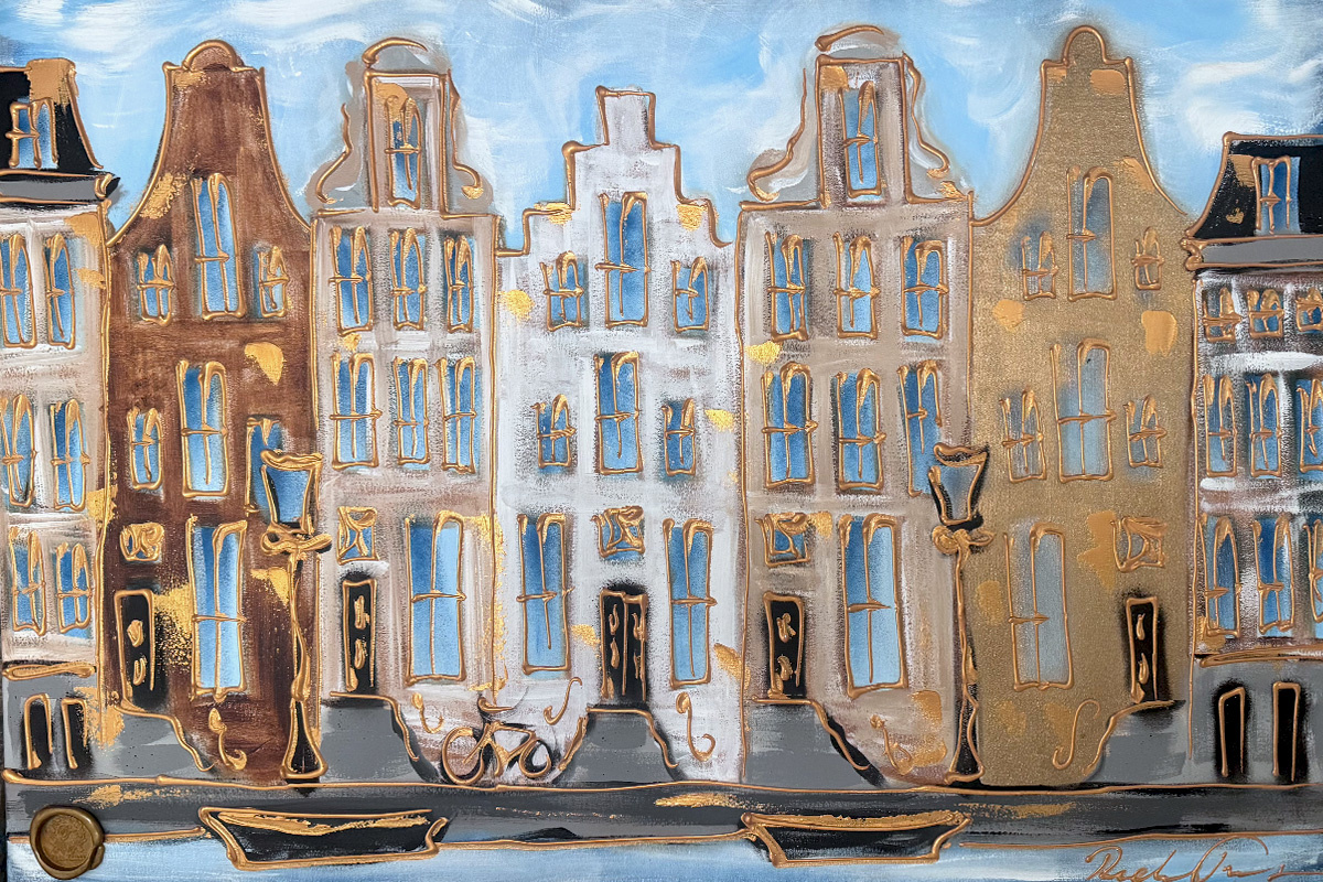 Rick bouwt zijn Amsterdam schilderijen op uit dikke lagen verf en werkt met een duidelijk handschrift wat zijn signatuur vormt. De dikke gouden lijn tekening waarmee zijn werk wordt afgemaakt doet de kijker al snel denken aan Amsterdam in de gouden eeuw.