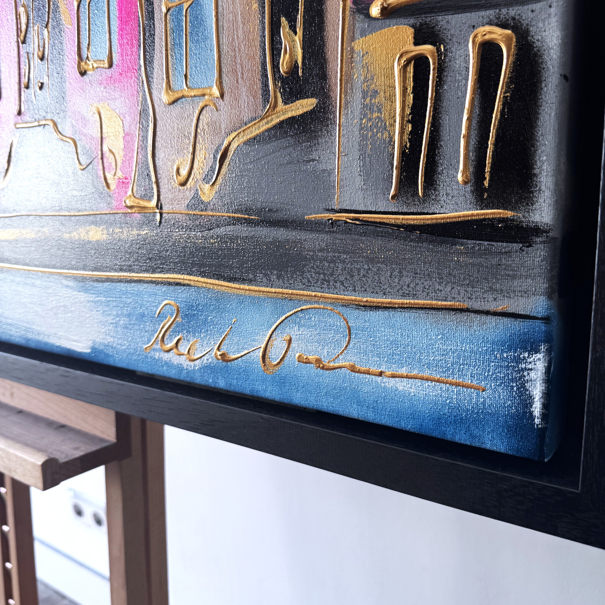 Rick bouwt zijn Amsterdam schilderijen op uit dikke lagen verf en werkt met een duidelijk handschrift wat zijn signatuur vormt. De dikke gouden lijn tekening waarmee zijn werk wordt afgemaakt doet de kijker al snel denken aan Amsterdam in de gouden eeuw.