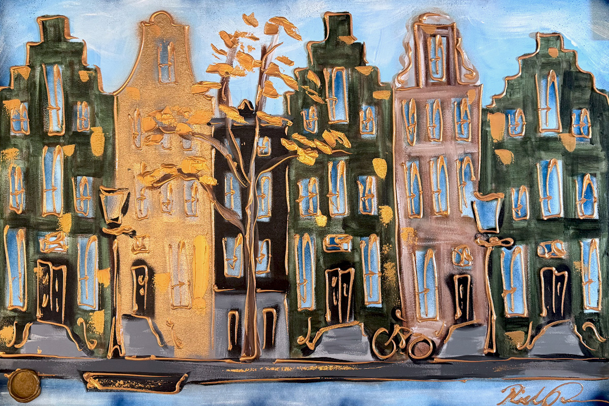 Rick bouwt zijn Amsterdam schilderijen op uit dikke lagen verf en werkt met een duidelijk handschrift wat zijn signatuur vormt. De dikke gouden lijn tekening waarmee zijn werk wordt afgemaakt doet de kijker al snel denken aan Amsterdam in de gouden eeuw.