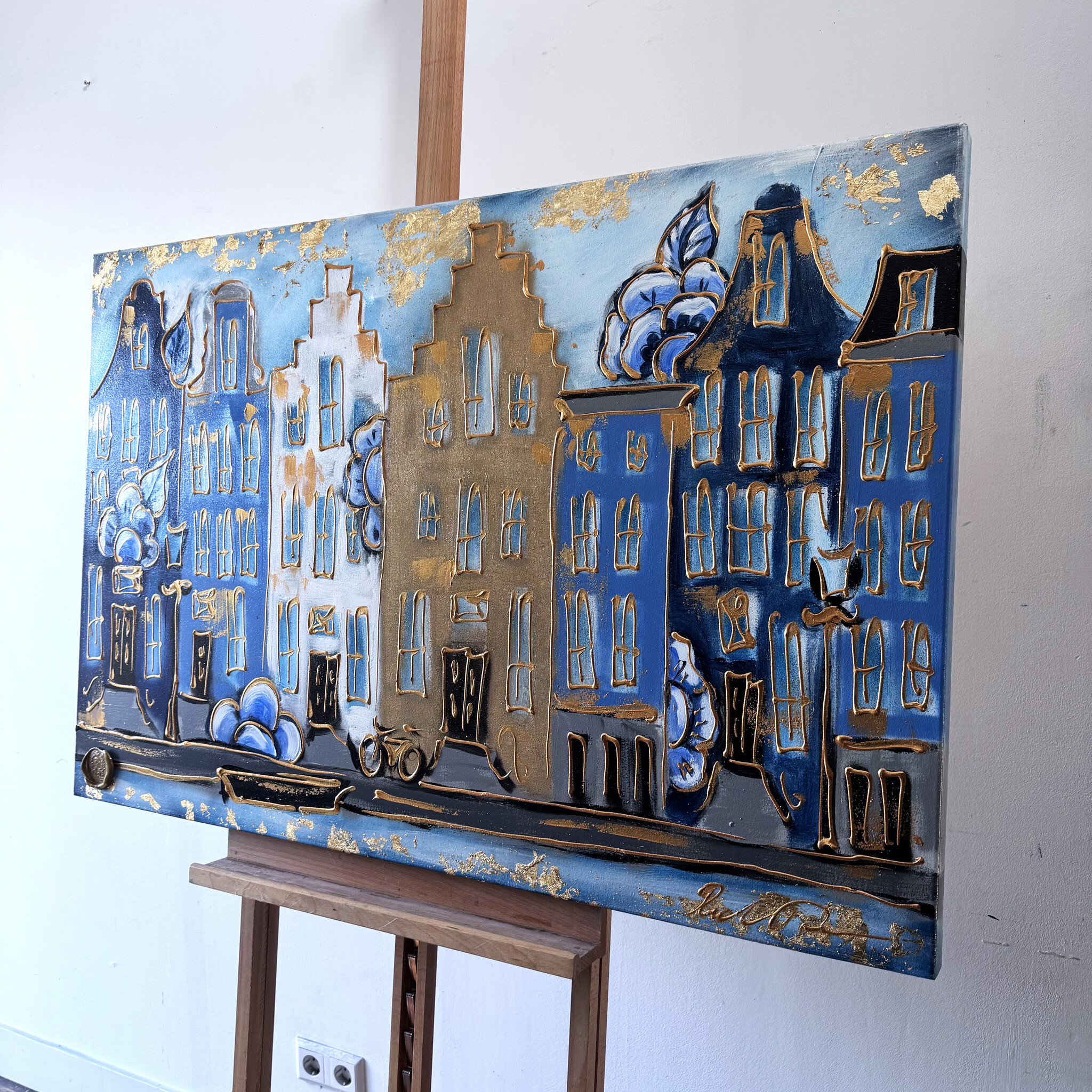 Artist Note: Mijn werken in de Amsterdam serie, zijn gemaakt in diverse lagen acryl verf, geïnspireerd op de glacis techniek van Rembrandt. Ook zo zichtbaar is de frottis techniek van de droge kwast in combinatie met in Parijs gekocht oliepastels van Sennelier (bekend van Picasso). Ook is de vrije tekenstijl, die ik opzet met houtskool, zeer kenmerkend. Elke laag van het werk ligt bloot door deze gemengde technieken.