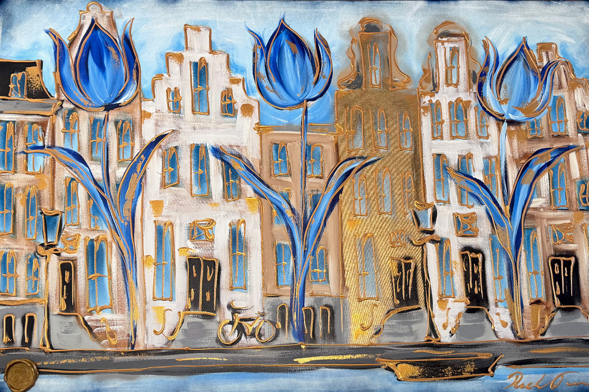 • Schilderij- 80x120x4,5 cm - Rick Triest - Amsterdamse grachtenhuizen met blauwe tulpen #1