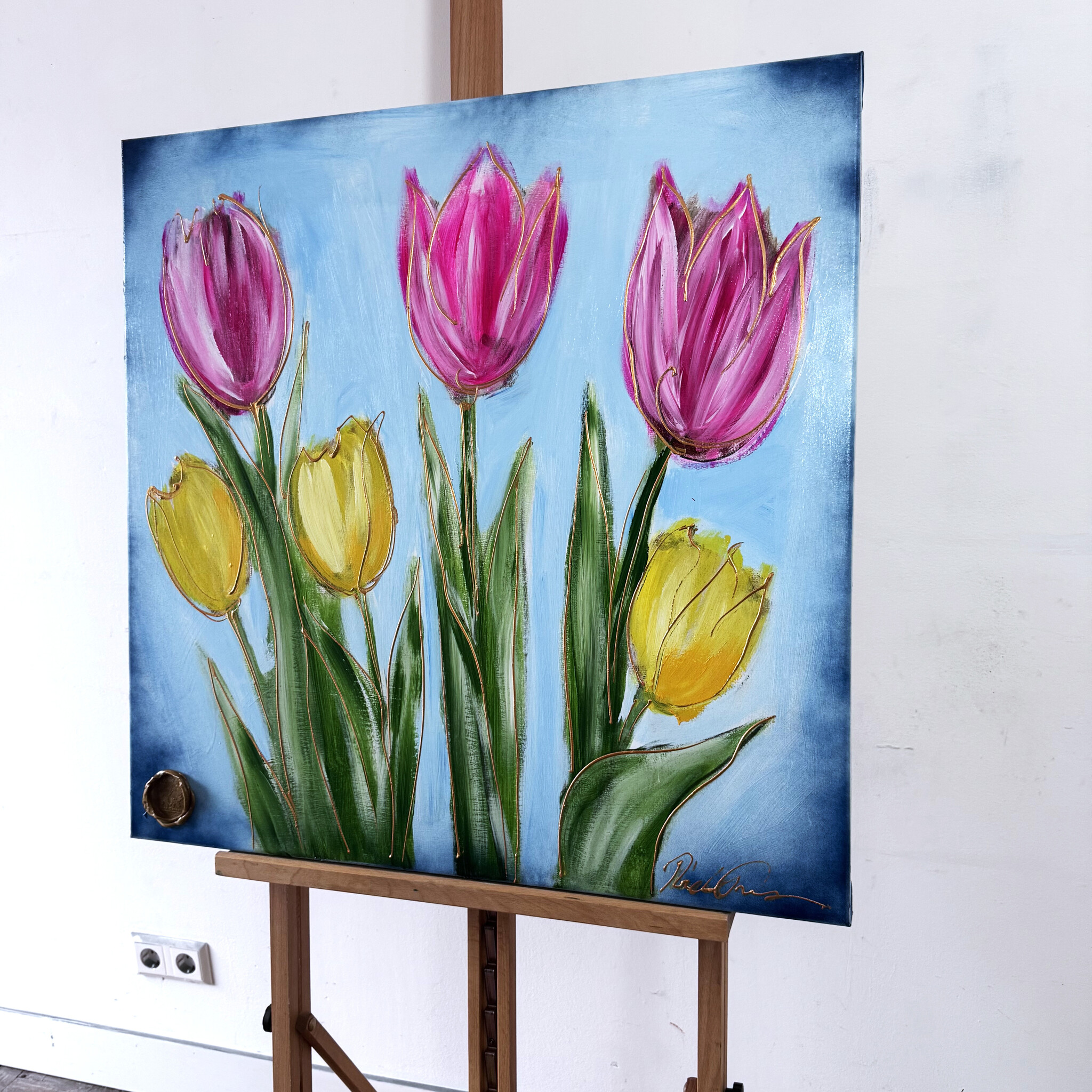 Artist Note: Mijn werken in de Serie Tulp Mania, zijn gemaakt in diverse lagen acryl verf, geïnspireerd op de glacis techniek van Rembrandt. Ook zo zichtbaar is de frottis techniek van de droge kwast in combinatie met in Parijs gekocht oliepastels van Sennelier. Ook is de vrije tekenstijl van de tulpen, die ik opzet met houtskool, zeer kenmerkend. Elke laag van het werk ligt bloot door deze gemengde technieken.