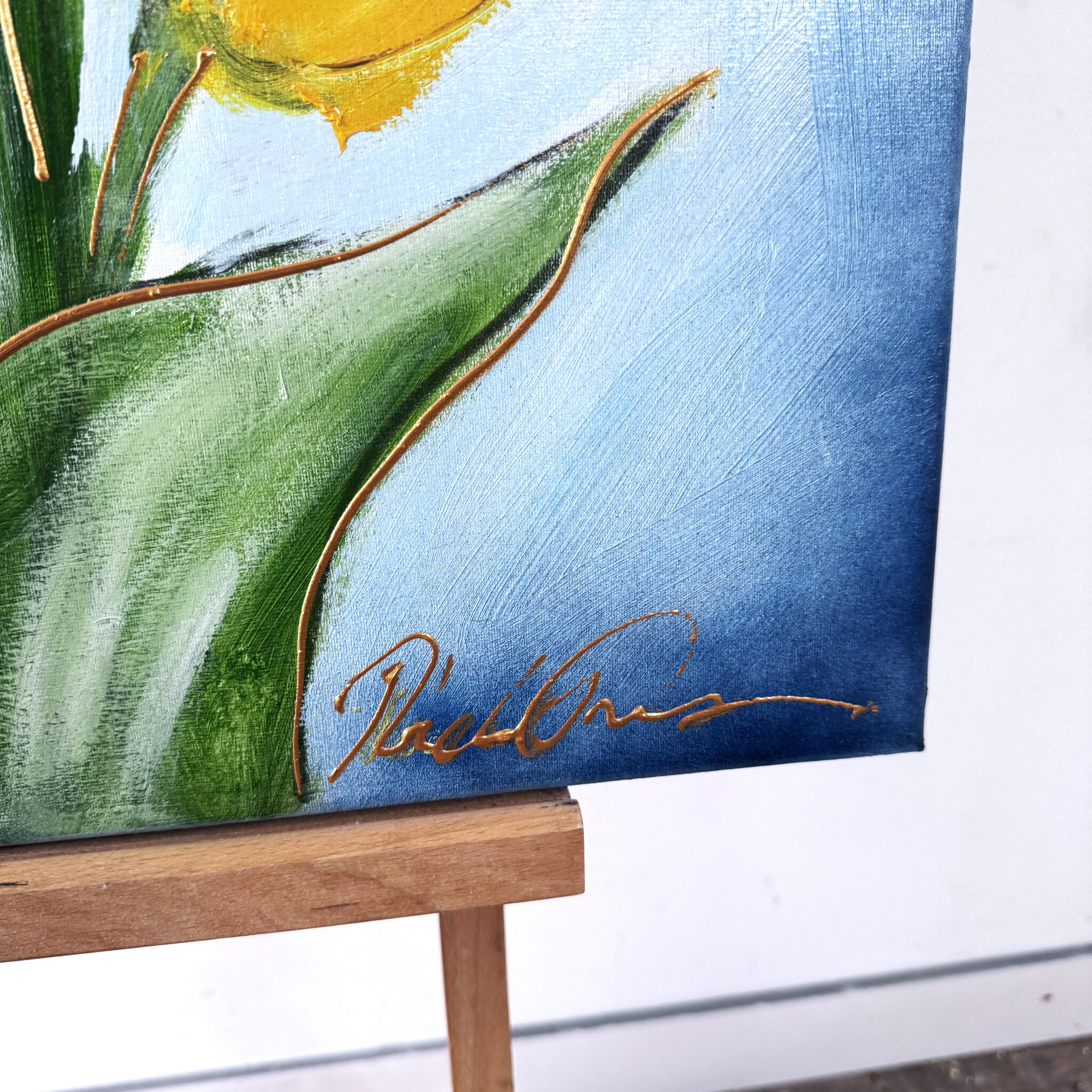 Rick bouwt de tulpen schilderijen op uit dikke lagen verf en werkt met een duidelijk handschrift wat zijn signatuur vormt. De dikke gouden lijn tekening waarmee zijn werk wordt afgemaakt doet de kijker al snel denken aan Amsterdam & Nederland in de gouden eeuw.