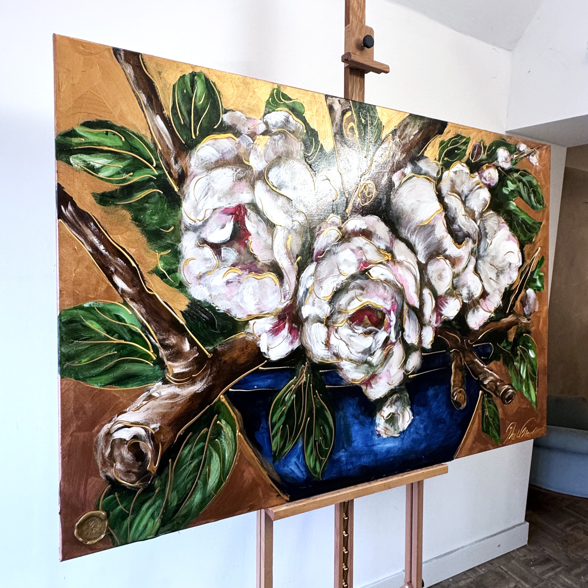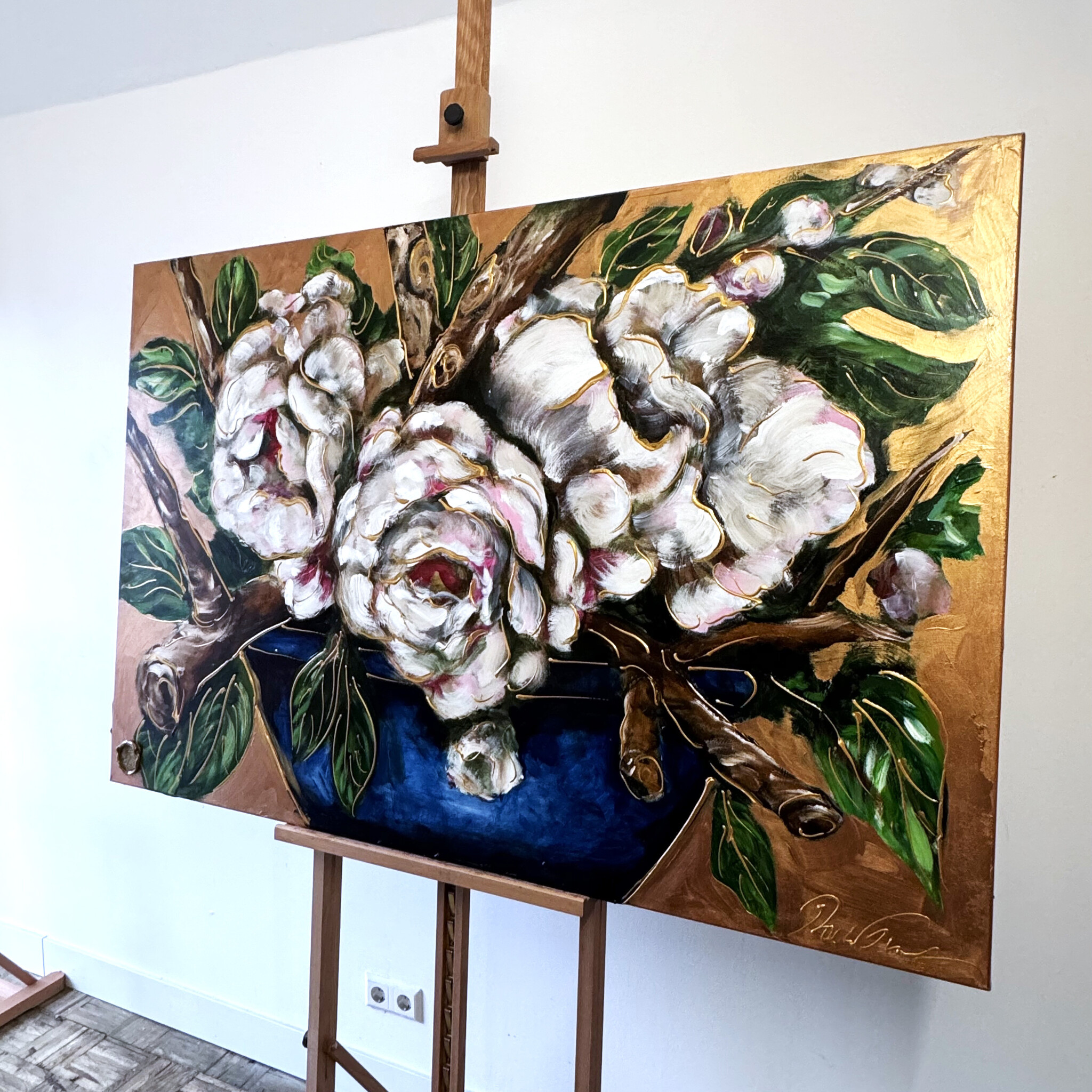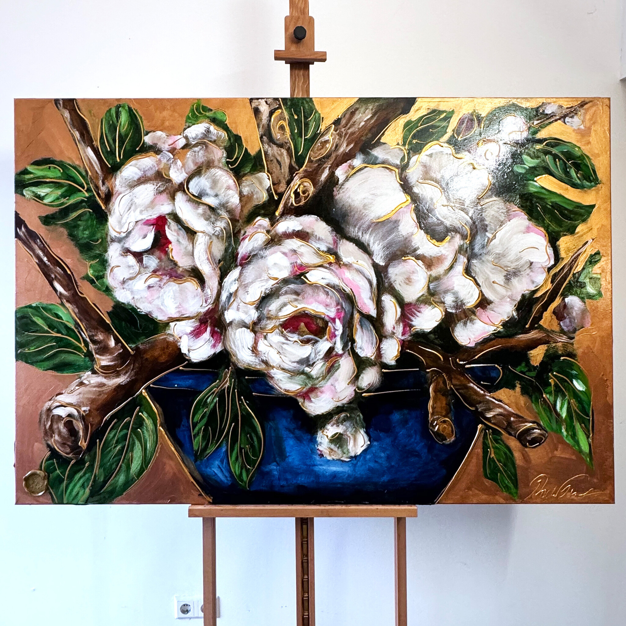 Rick bouwt de tulpen schilderijen op uit dikke lagen verf en werkt met een duidelijk handschrift wat zijn signatuur vormt. De dikke gouden lijn tekening waarmee zijn werk wordt afgemaakt doet de kijker al snel denken aan Amsterdam & Nederland in de gouden eeuw.