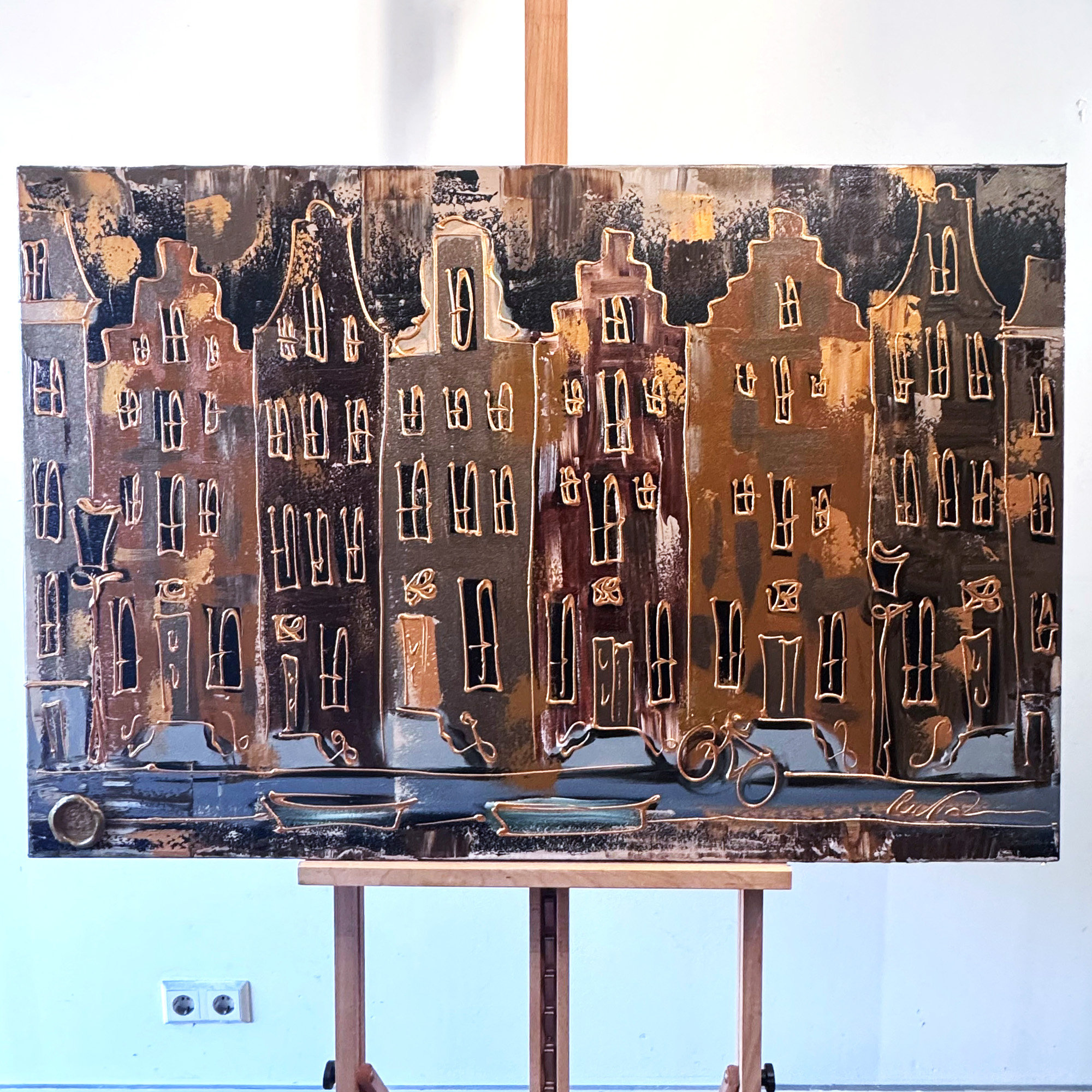 Schilderij- 80x120x4,5 cm - Amsterdam LUXURY style - grachten gevels in omber & Gold #225