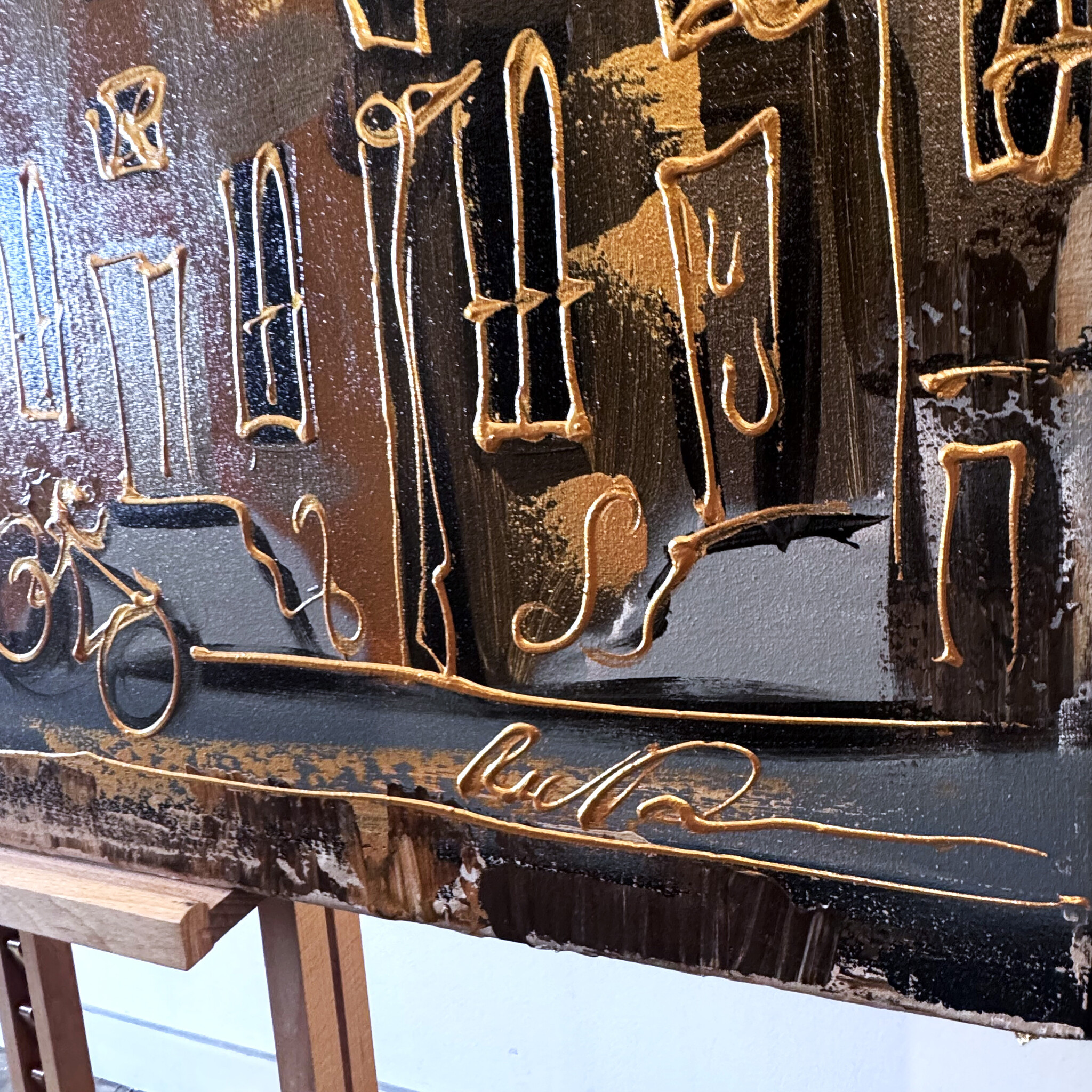 Rick bouwt zijn Amsterdam schilderijen op uit dikke lagen verf en werkt met een duidelijk handschrift wat zijn signatuur vormt. De dikke gouden lijn tekening waarmee zijn werk wordt afgemaakt doet de kijker al snel denken aan Amsterdam in de gouden eeuw.